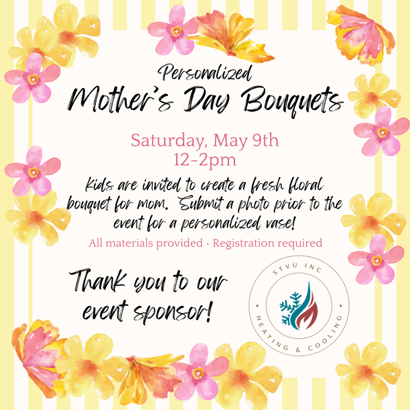 Kids are invited to create a fresh floral bouquet for mom. Submit a photo prior to the event for a personalized vase!