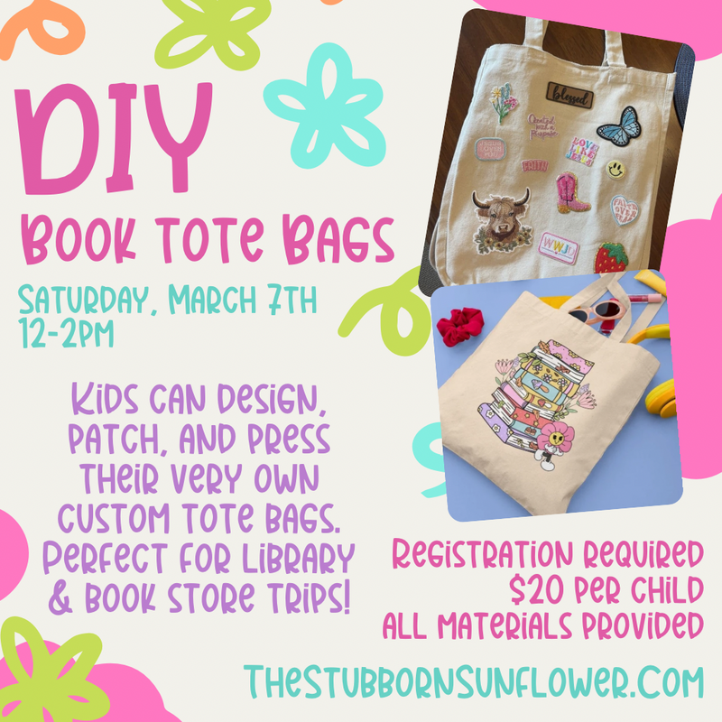 Kids can design, patch, and press their very own custom tote bags. Perfect for library & book store trips!