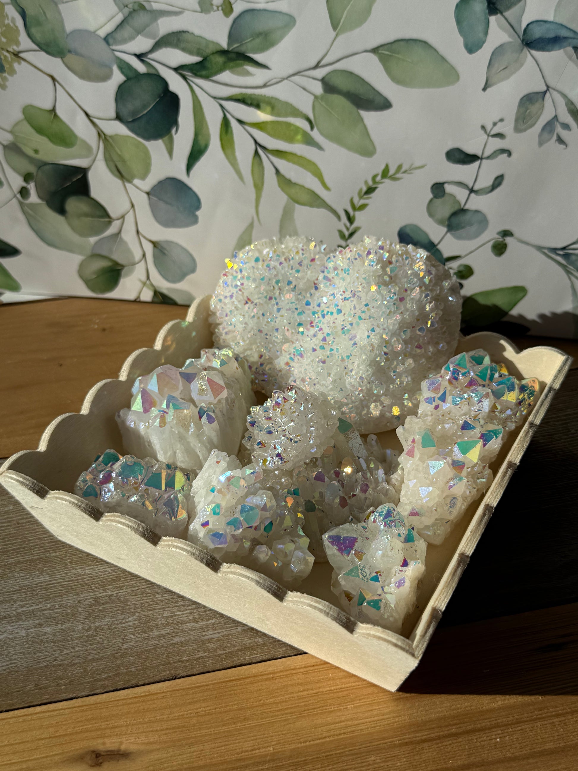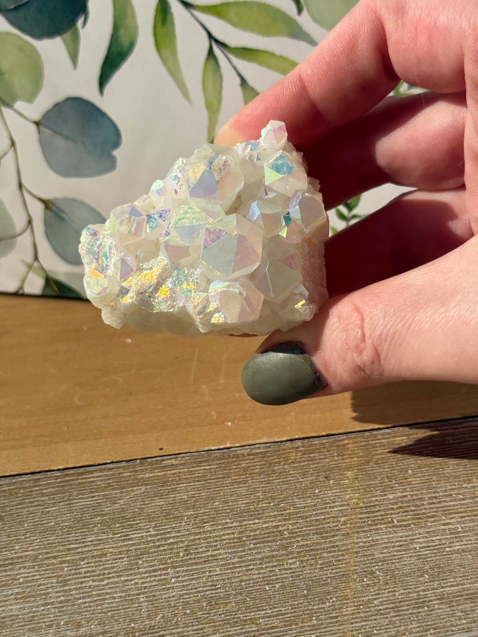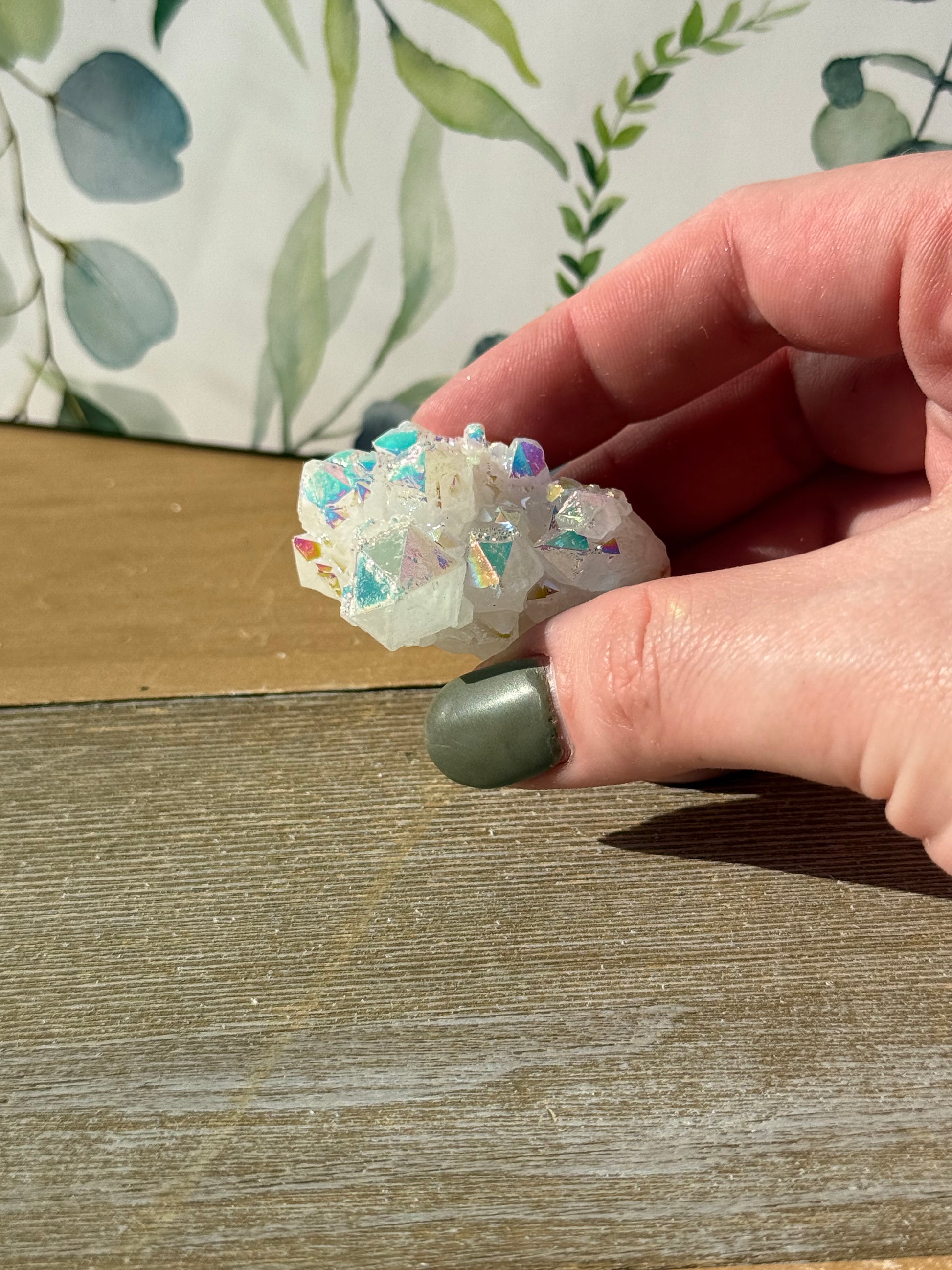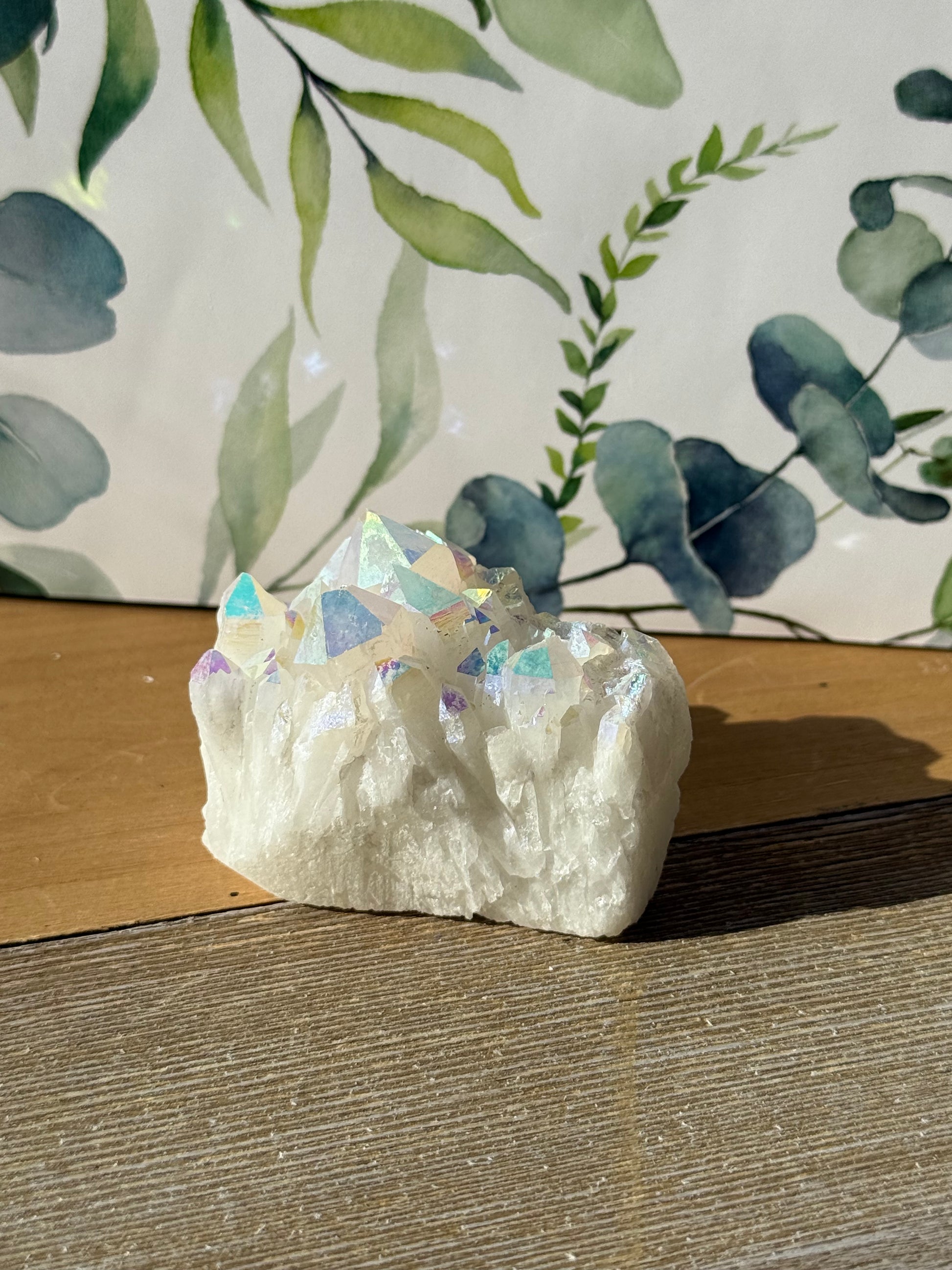Experience the beautiful sparkle and energy of our Angel Aura Quartz Clusters. With a variety of sizes to choose from, you can find the perfect cluster that best aligns with your vibes. Bring a touch of magic and harmony into your life with these stunning pieces.