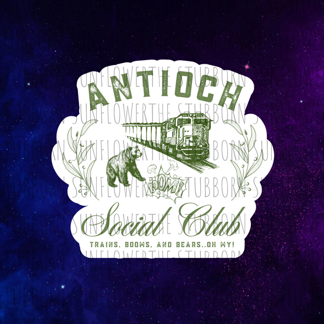Show off your quirky side with the Antioch Social Club sticker! Perfect for anyone who enjoys the infamous trains, boom sounds, and bears (oh my!), this sticker adds a playful touch to any surface. Put it on your laptop, water bottle, or even your car. All aboard the fun train!