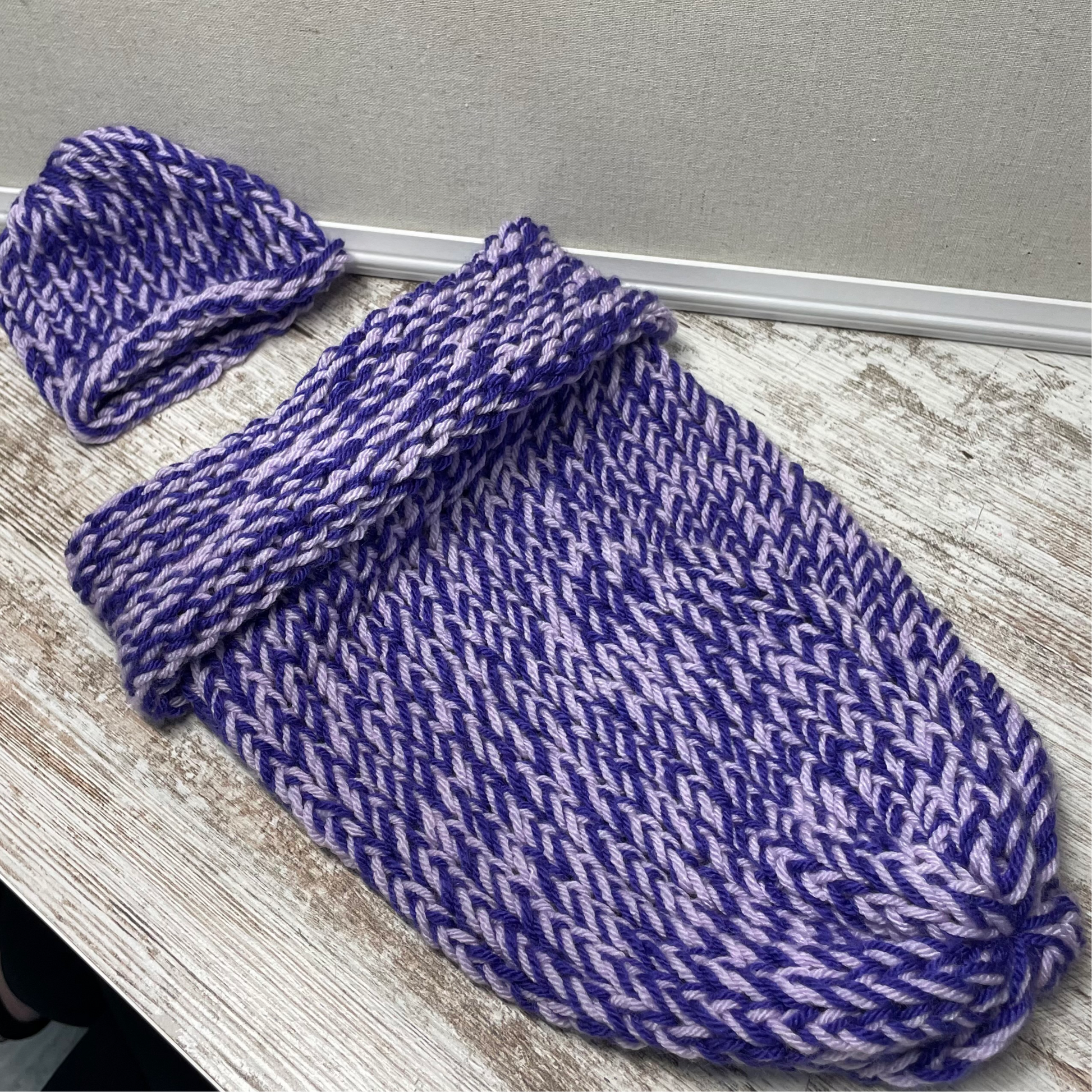 Wrap your little one in comfort and cuteness with our Baby Swaddle Sack & Hat! Made with cozy purple yarn, this swaddle sleep sack and matching hat will keep your baby snug and stylish. Perfect for naps and nighttime, and makes for an adorable photo op. Sleep tight, little one!