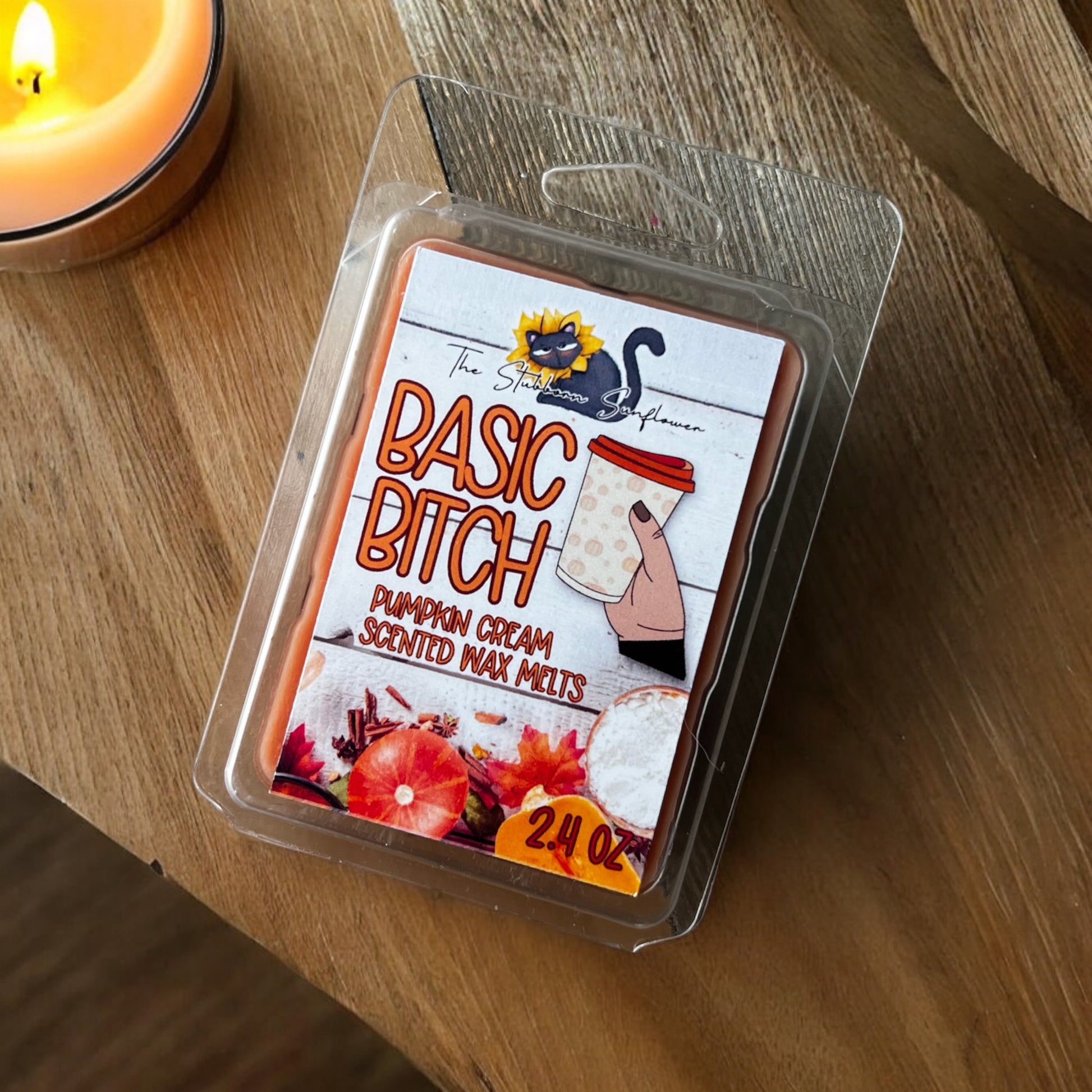 Liven up any room with our Basic Bitch Wax Melts in delicious pumpkin cream scent. Enjoy the calming aroma of fall while having some fun with this quirky product. Each 2.4oz melt will bring hours of delight. Get your basic on and grab yours now!