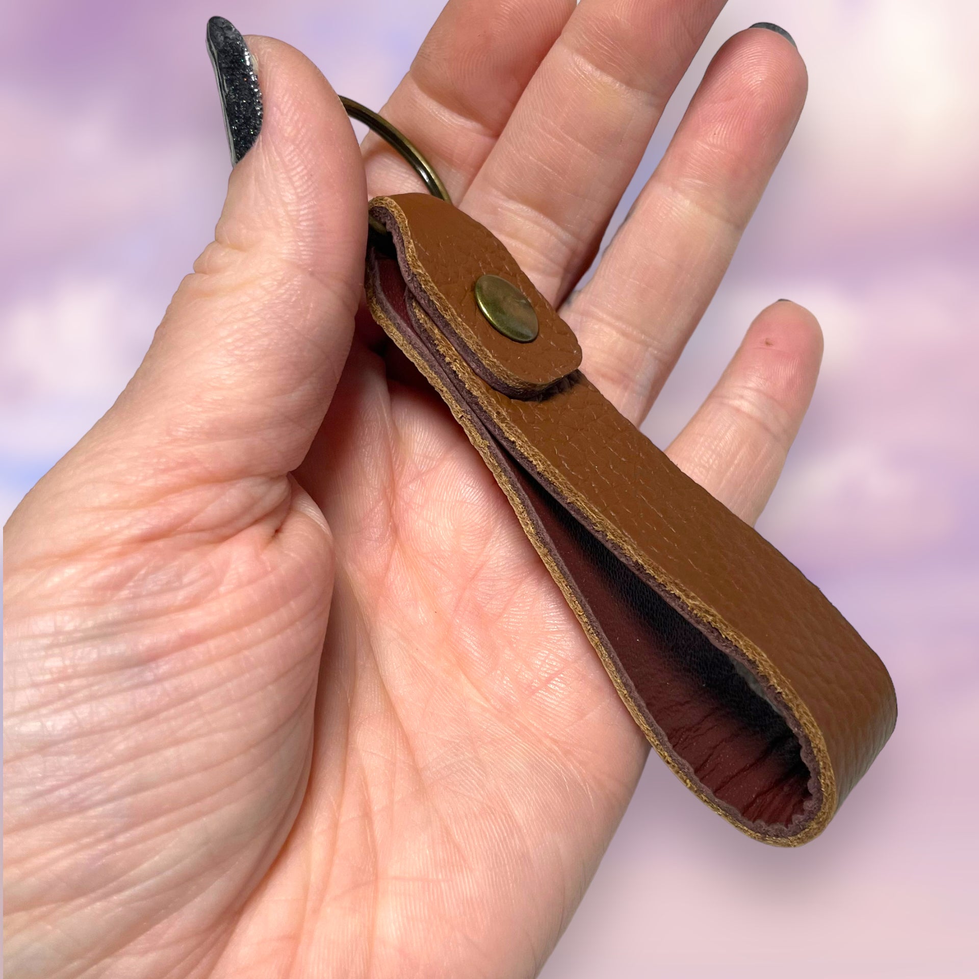These 3.5” leather loop keychains were cut and crafted by hand from a textured brown outer and smooth brown inner. Several options to choose from!