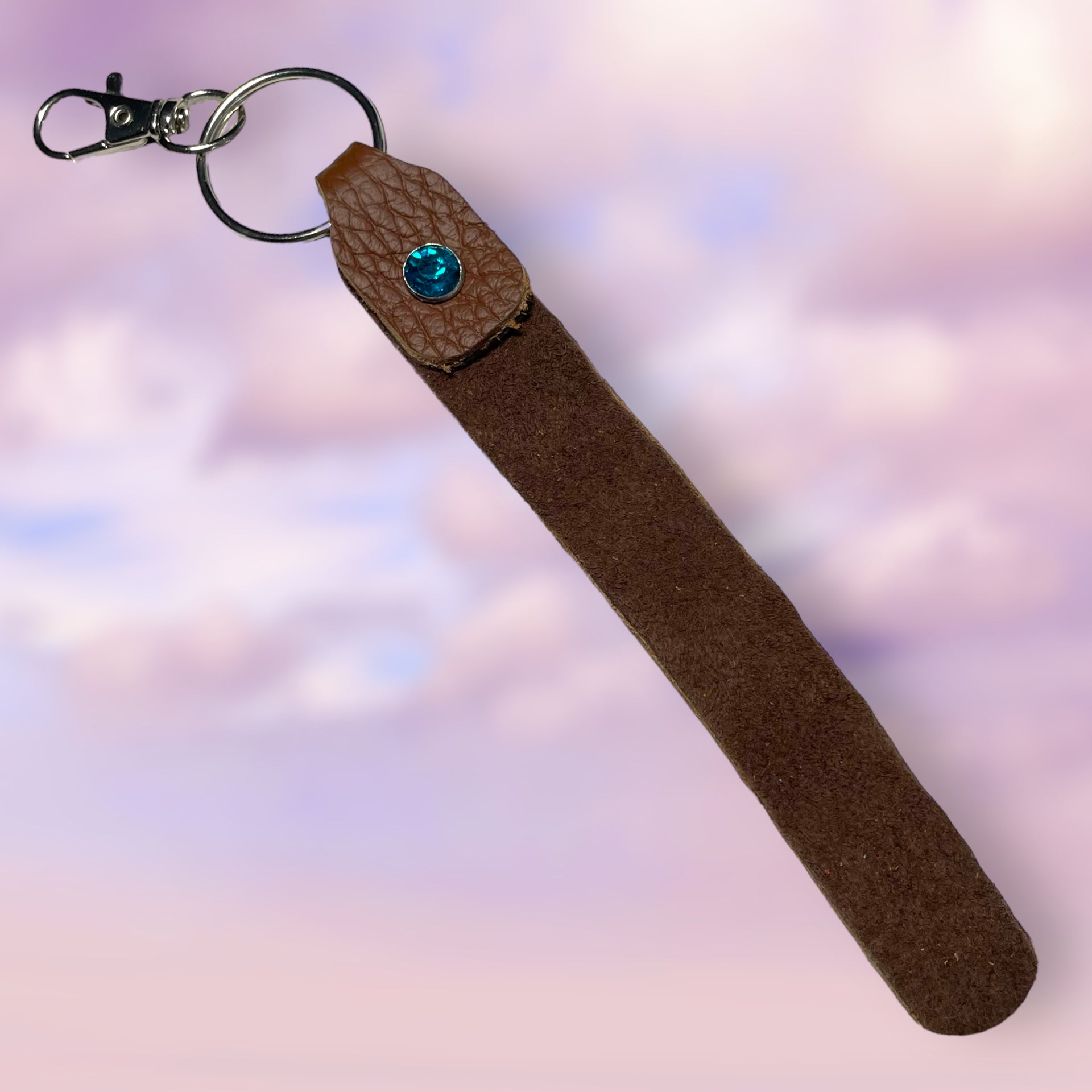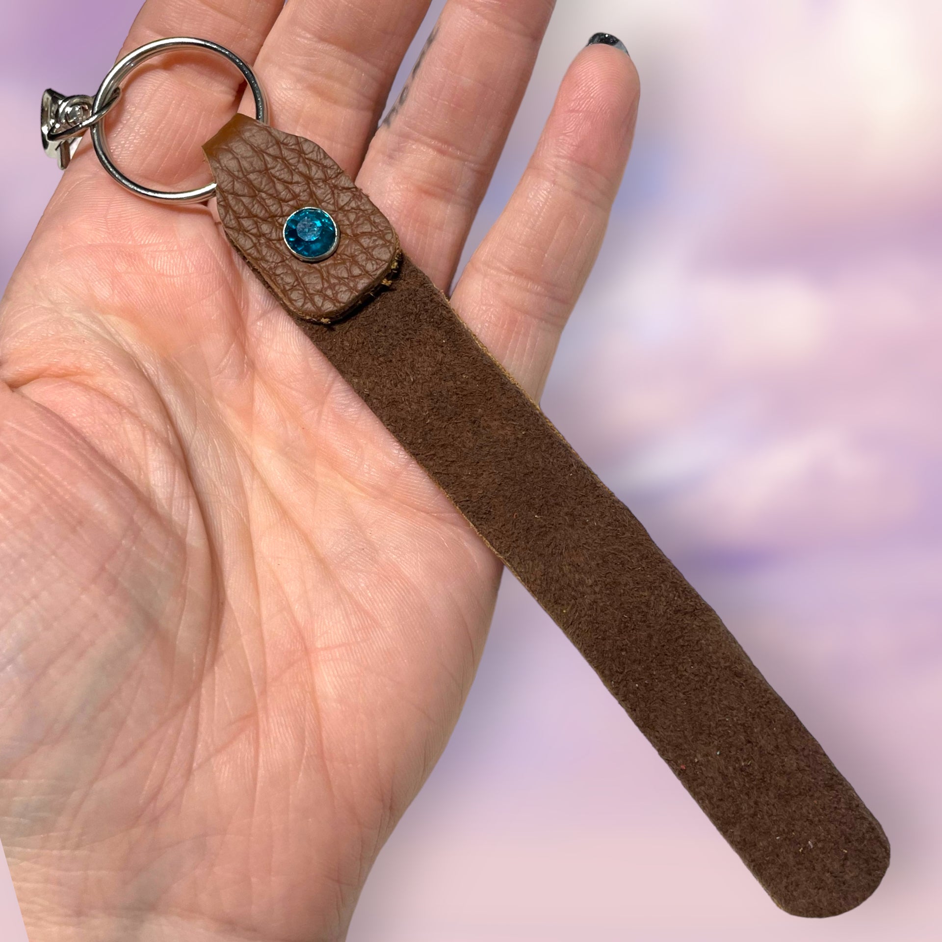 This leather keyring strap was cut and crafted by hand, and is perfect to keep a hold of your keys. Sitting at 5.5” at the longest point, this strap is made from soft brown leather with silver hardware and a blue rhinestone accent
