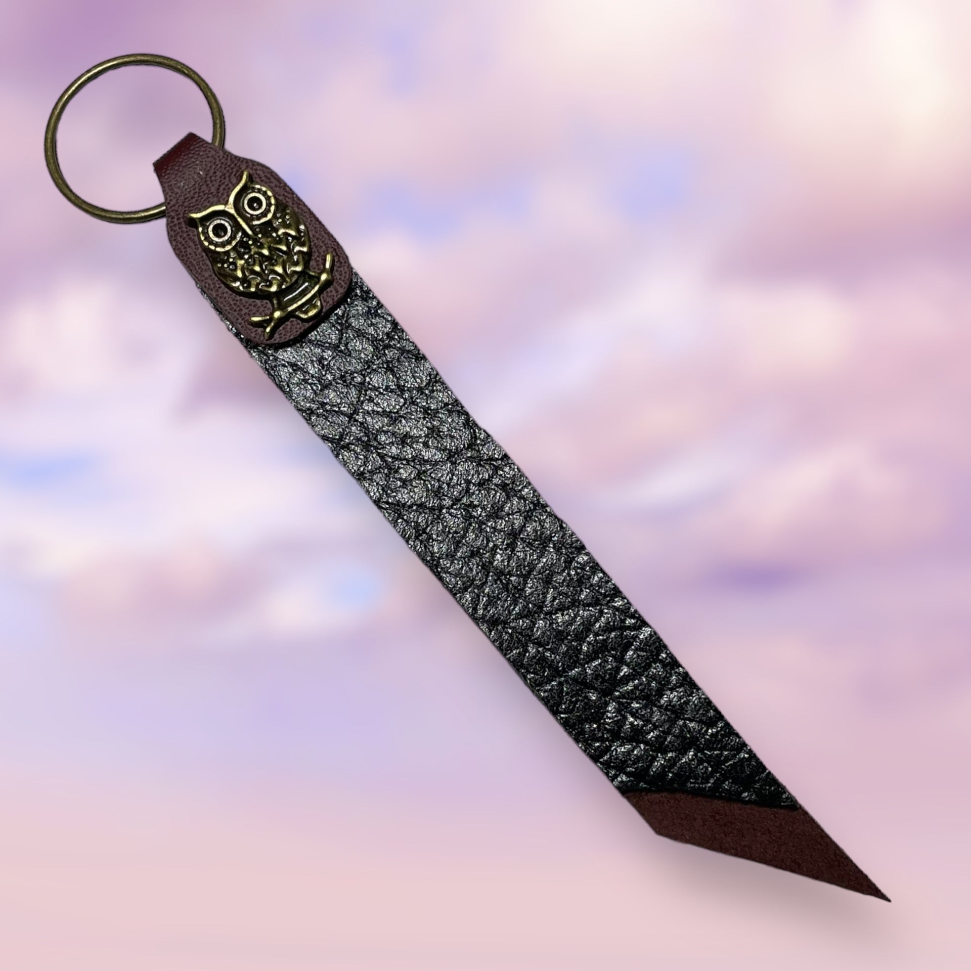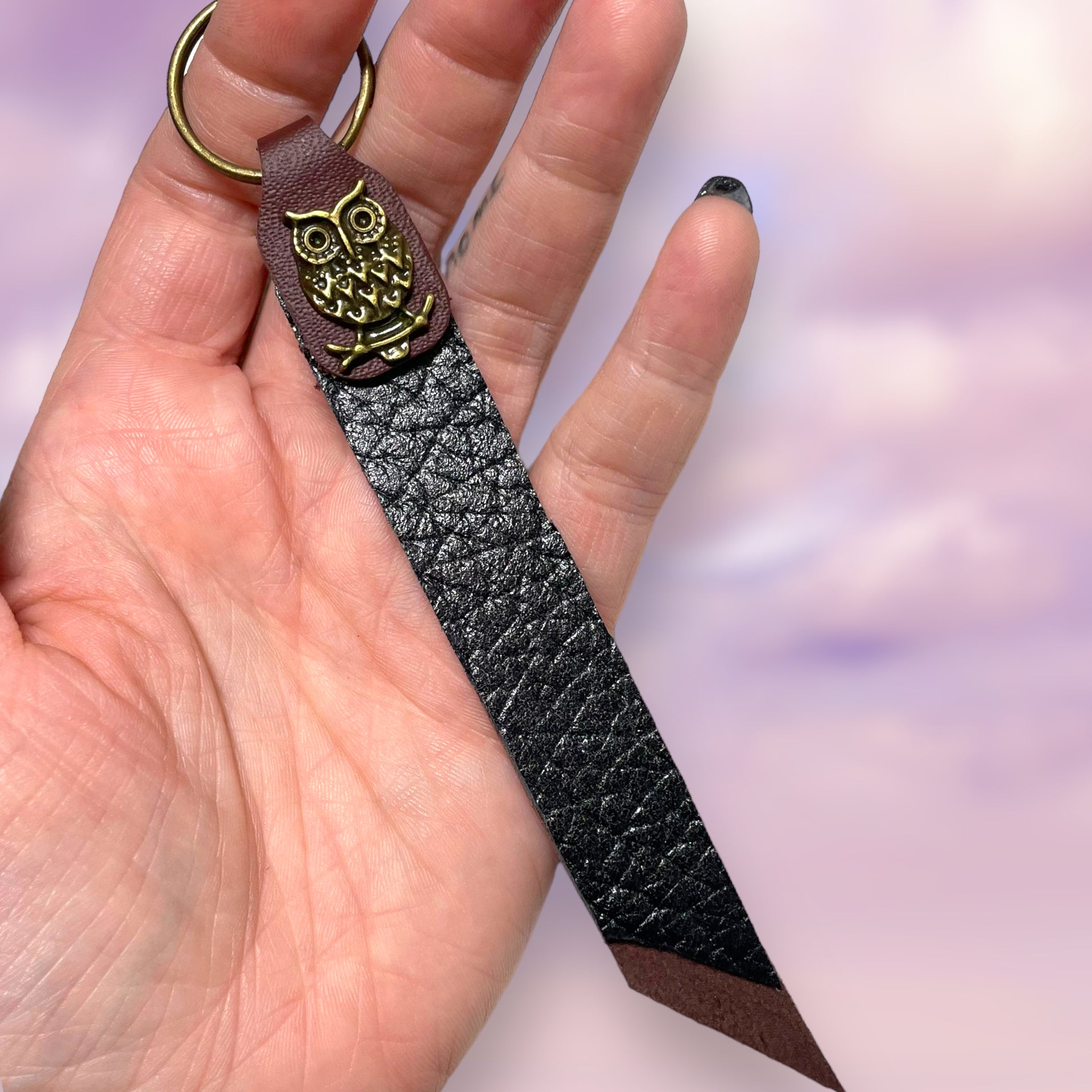 This leather keyring strap was cut and crafted by hand, and is perfect to keep a hold of your keys. Sitting at 5” at the longest point, this strap has textured black and smooth maroon leather with weathered gold hardware and an owl rivet