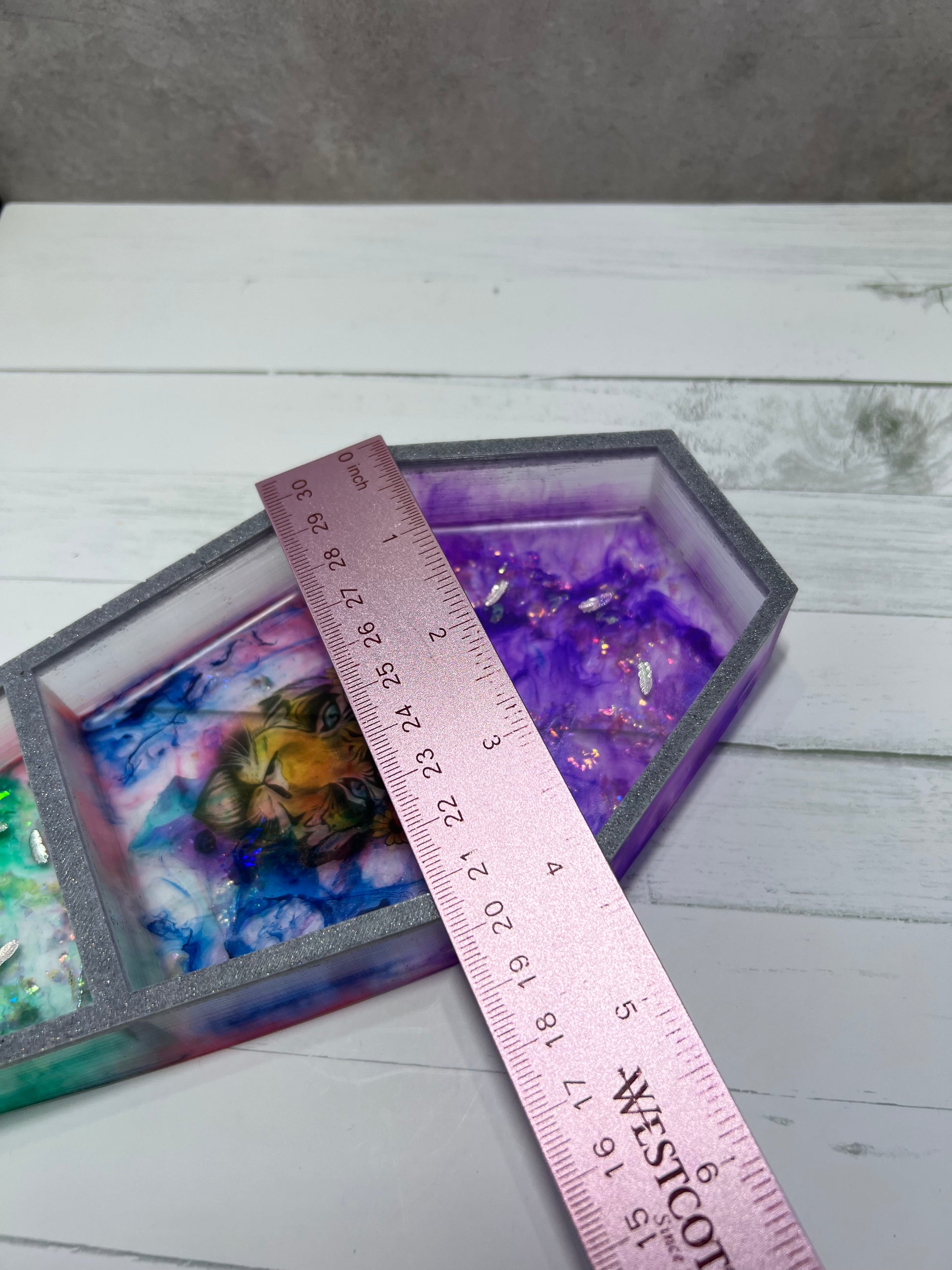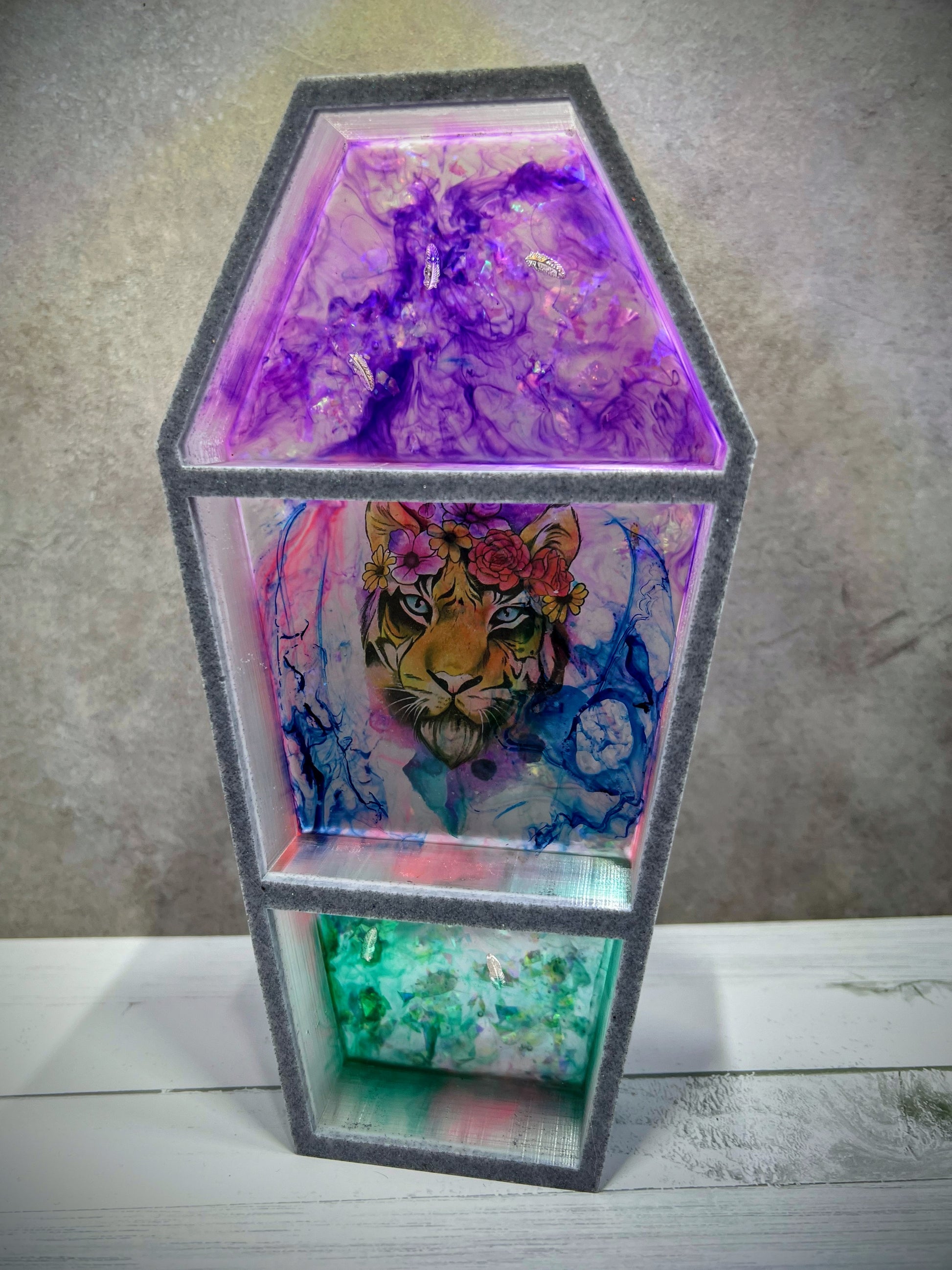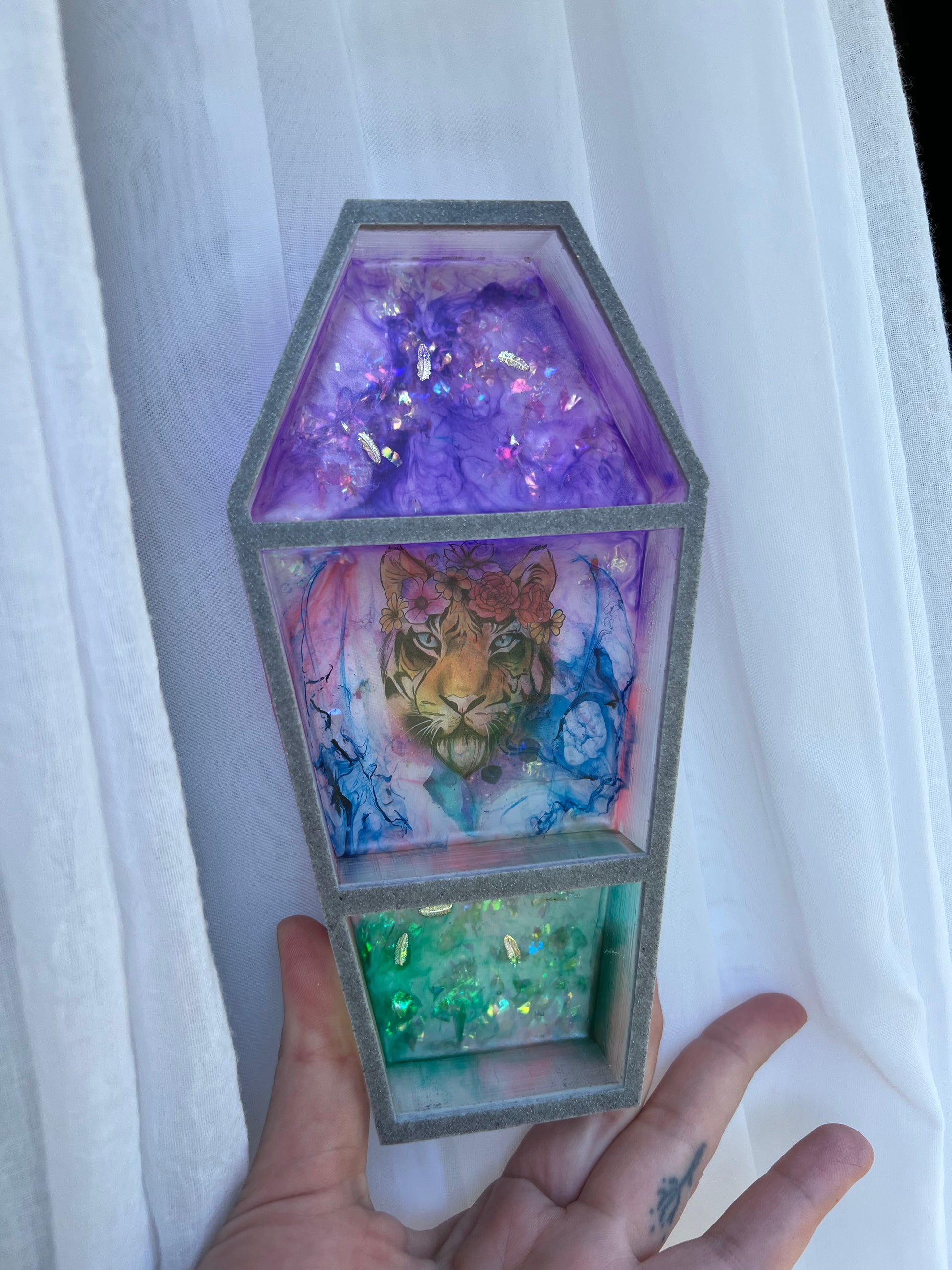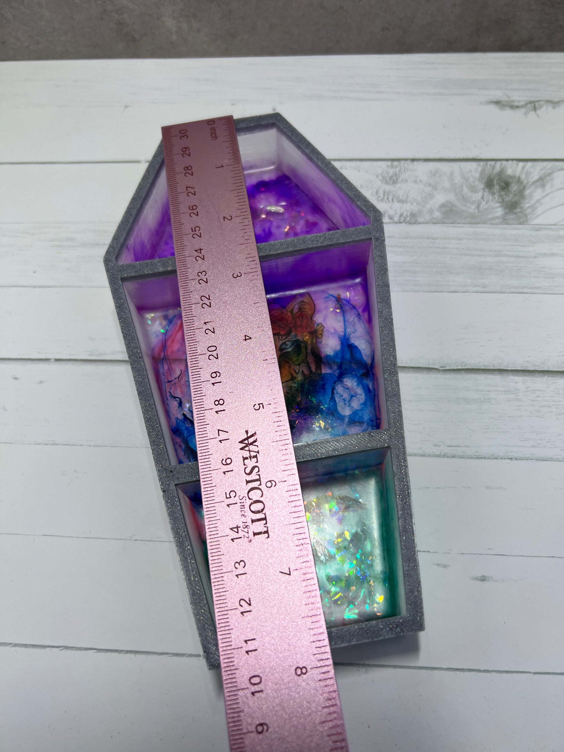 Challenge your interior decor with this Coffin Shelf. Featuring a unique coffin shape, beautiful images, and vibrant alcohol inks - this offers a unique and daring look. Keep your crystals safe on the two shelves or use it to make a bold statement.
