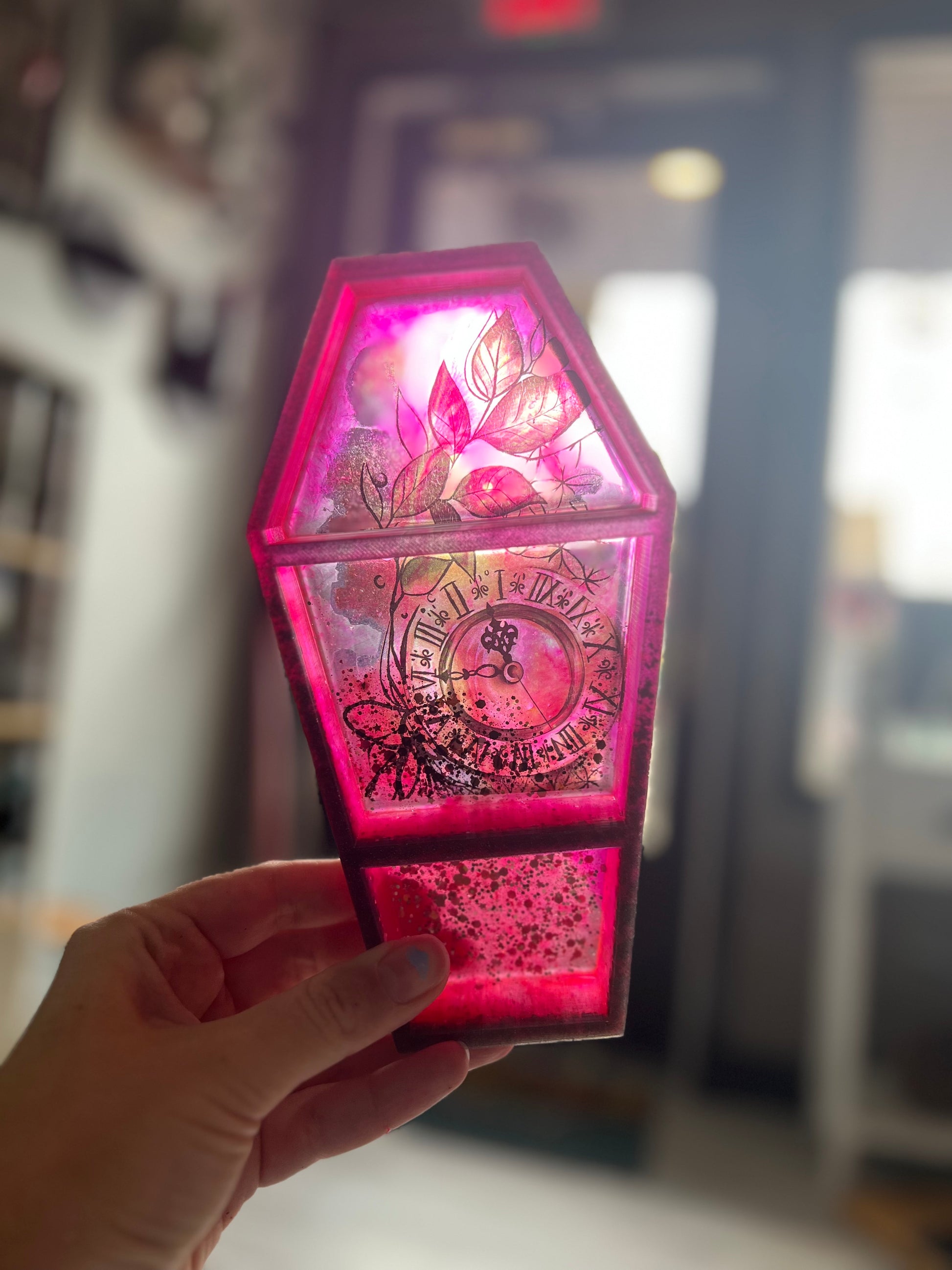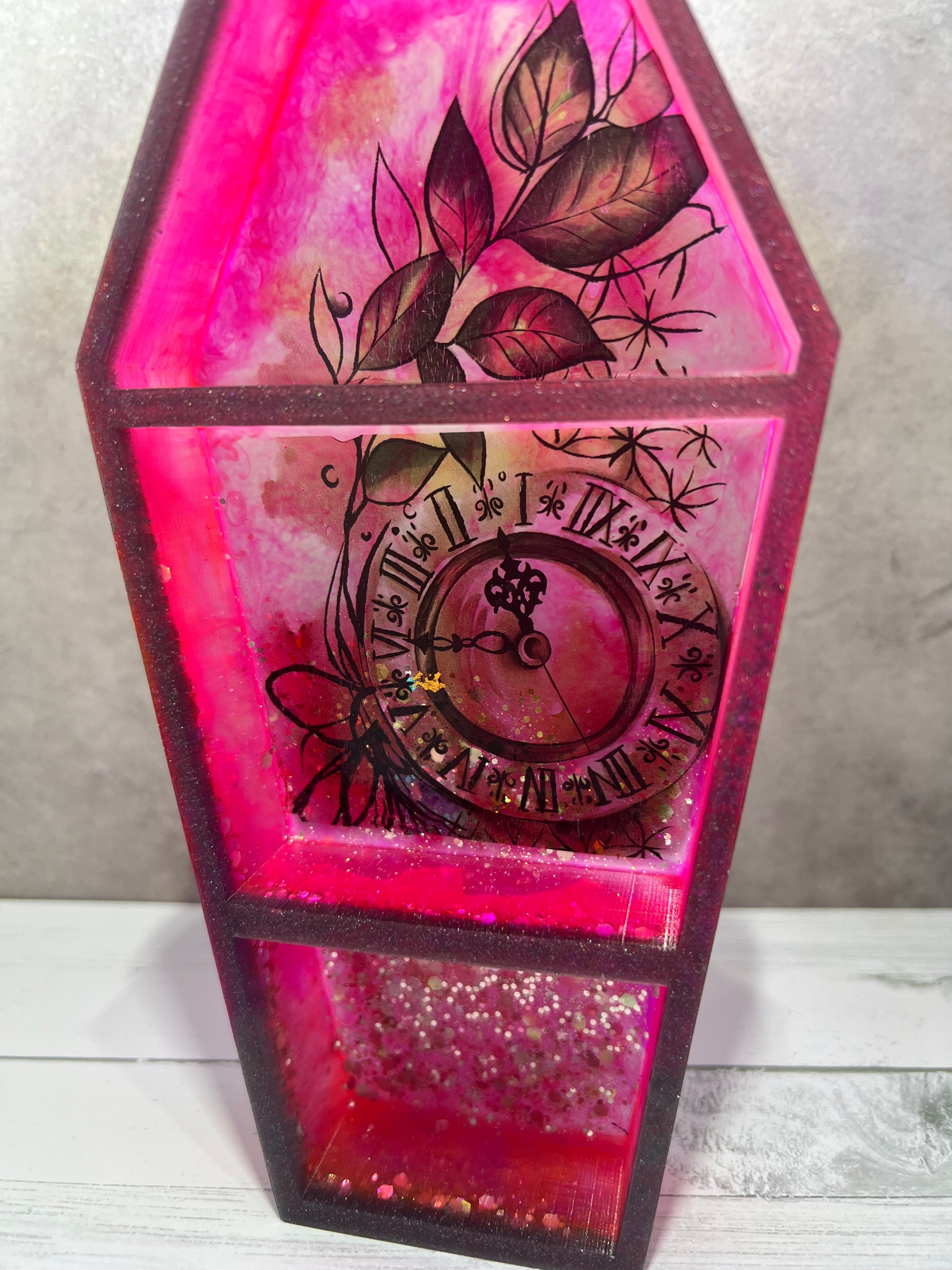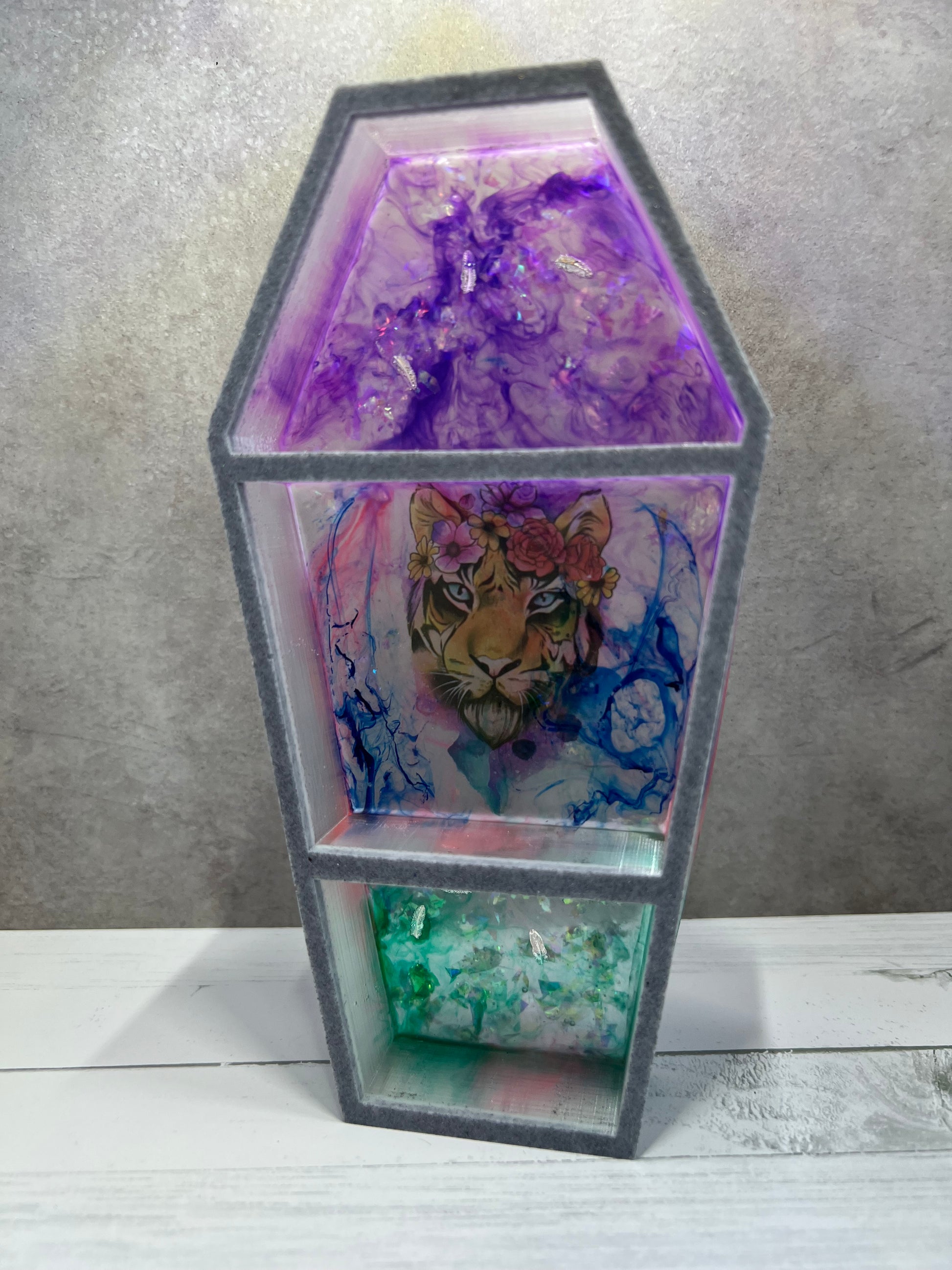 Challenge your interior decor with this Coffin Shelf. Featuring a unique coffin shape, beautiful images, and vibrant alcohol inks - this offers a unique and daring look. Keep your crystals safe on the two shelves or use it to make a bold statement.