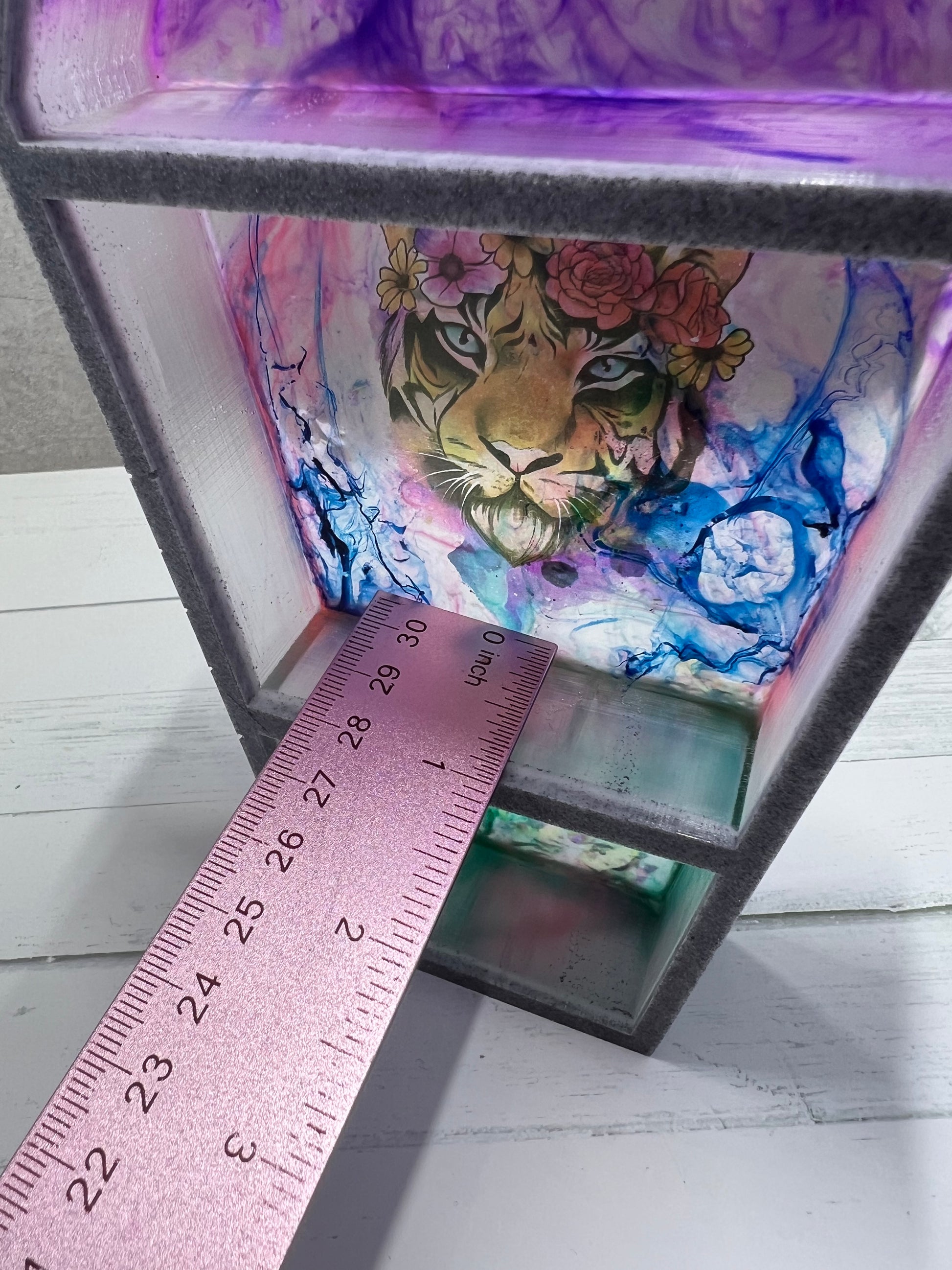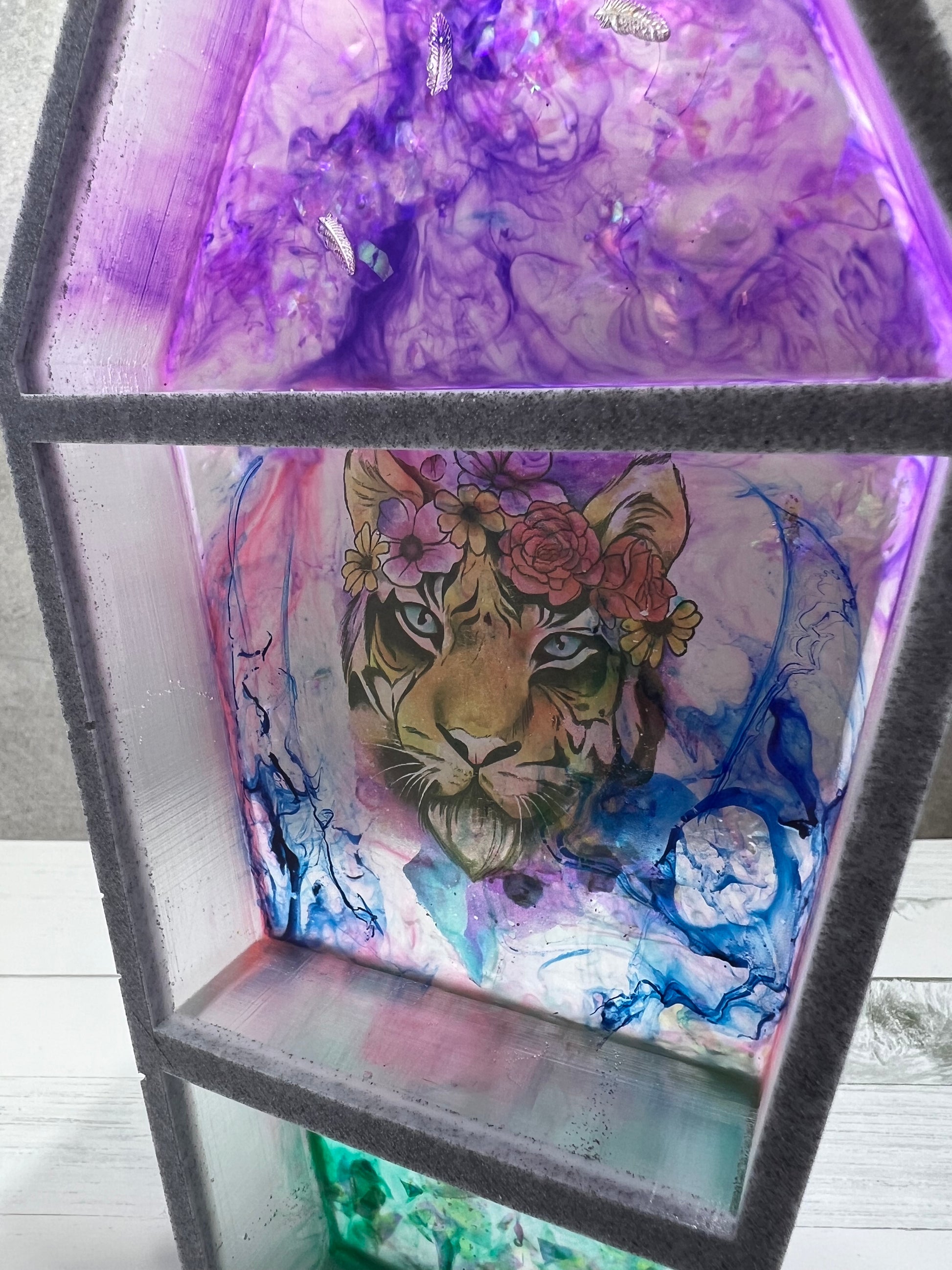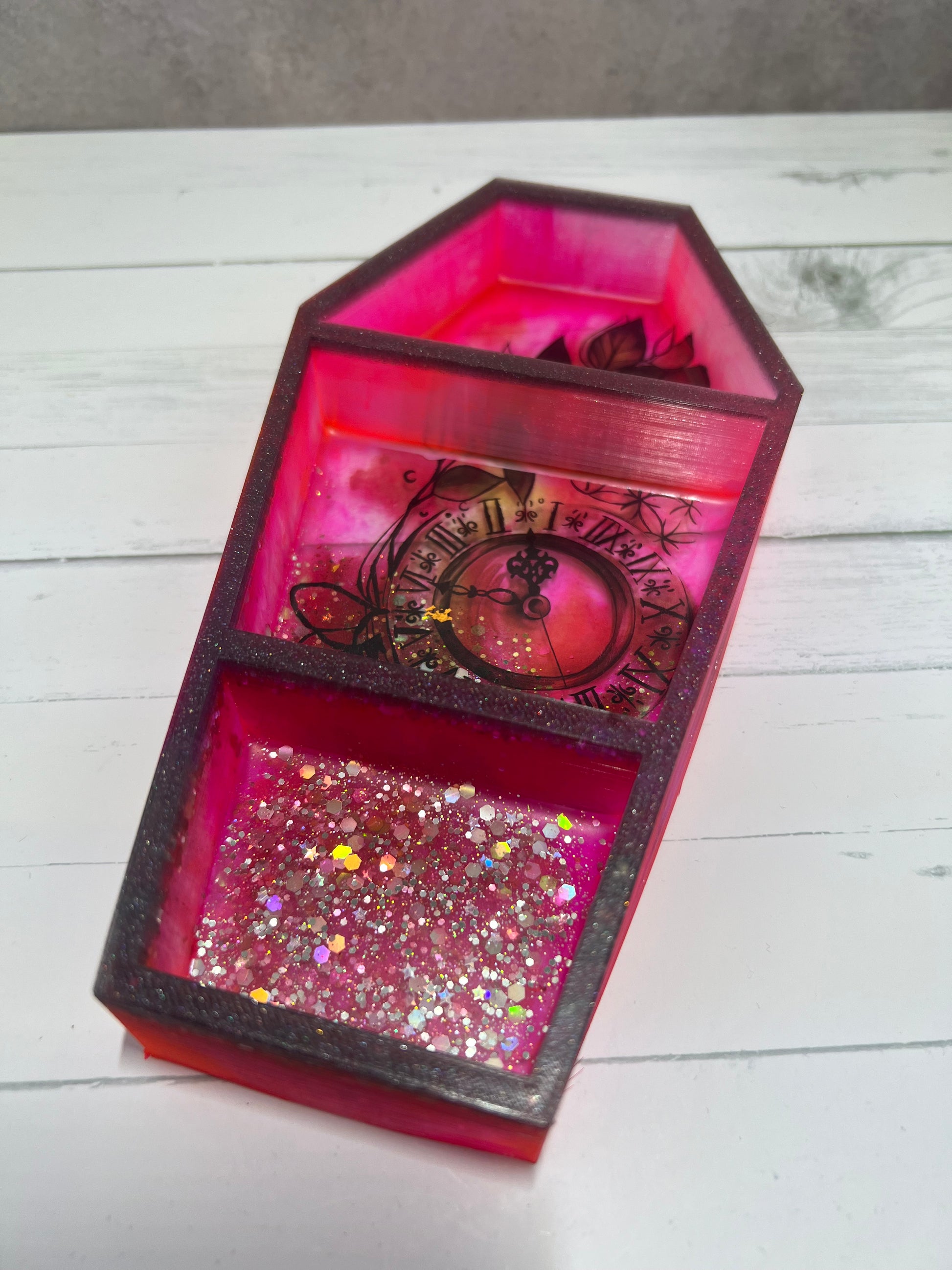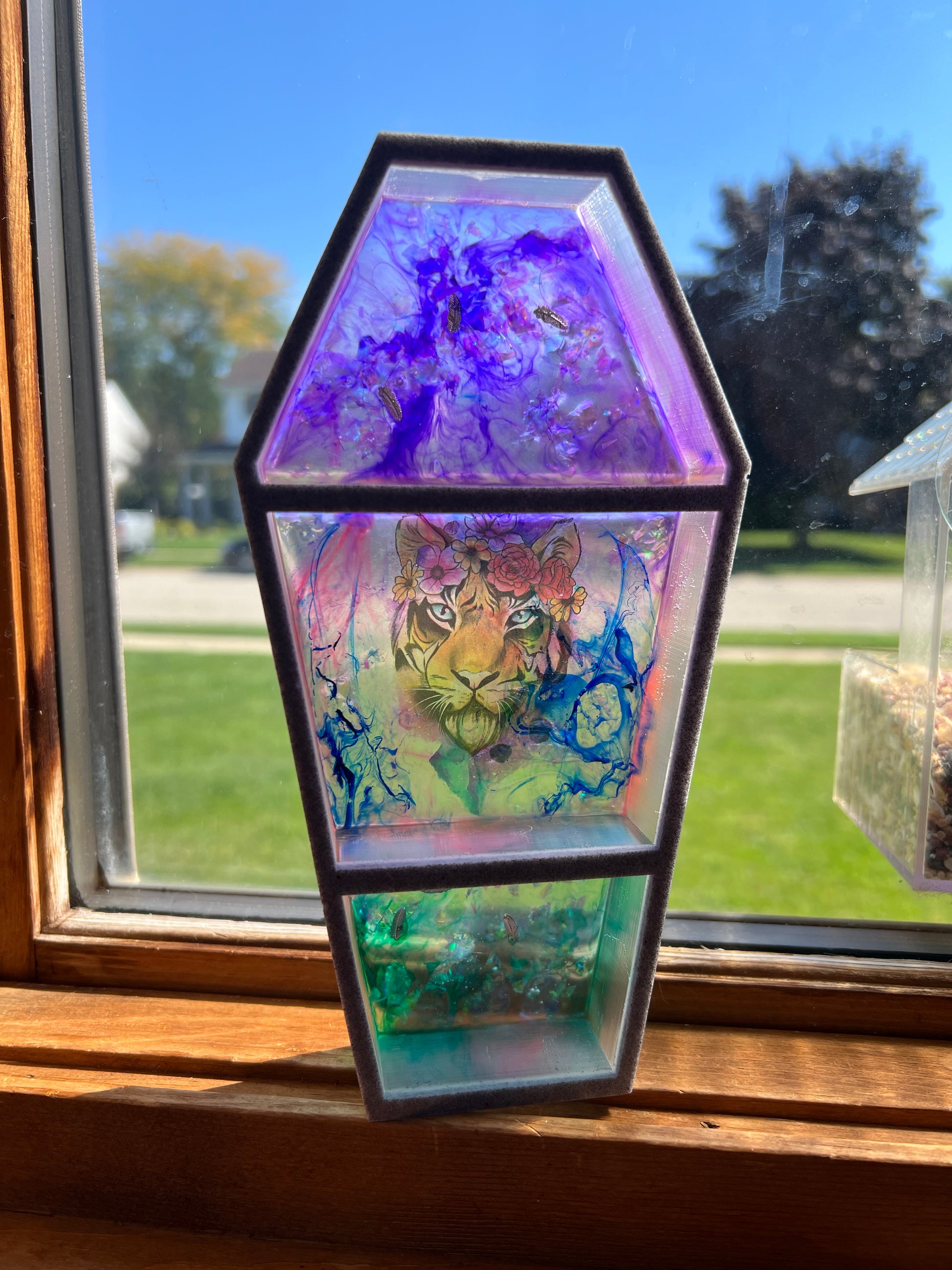 Challenge your interior decor with this Coffin Shelf. Featuring a unique coffin shape, beautiful images, and vibrant alcohol inks - this offers a unique and daring look. Keep your crystals safe on the two shelves or use it to make a bold statement.