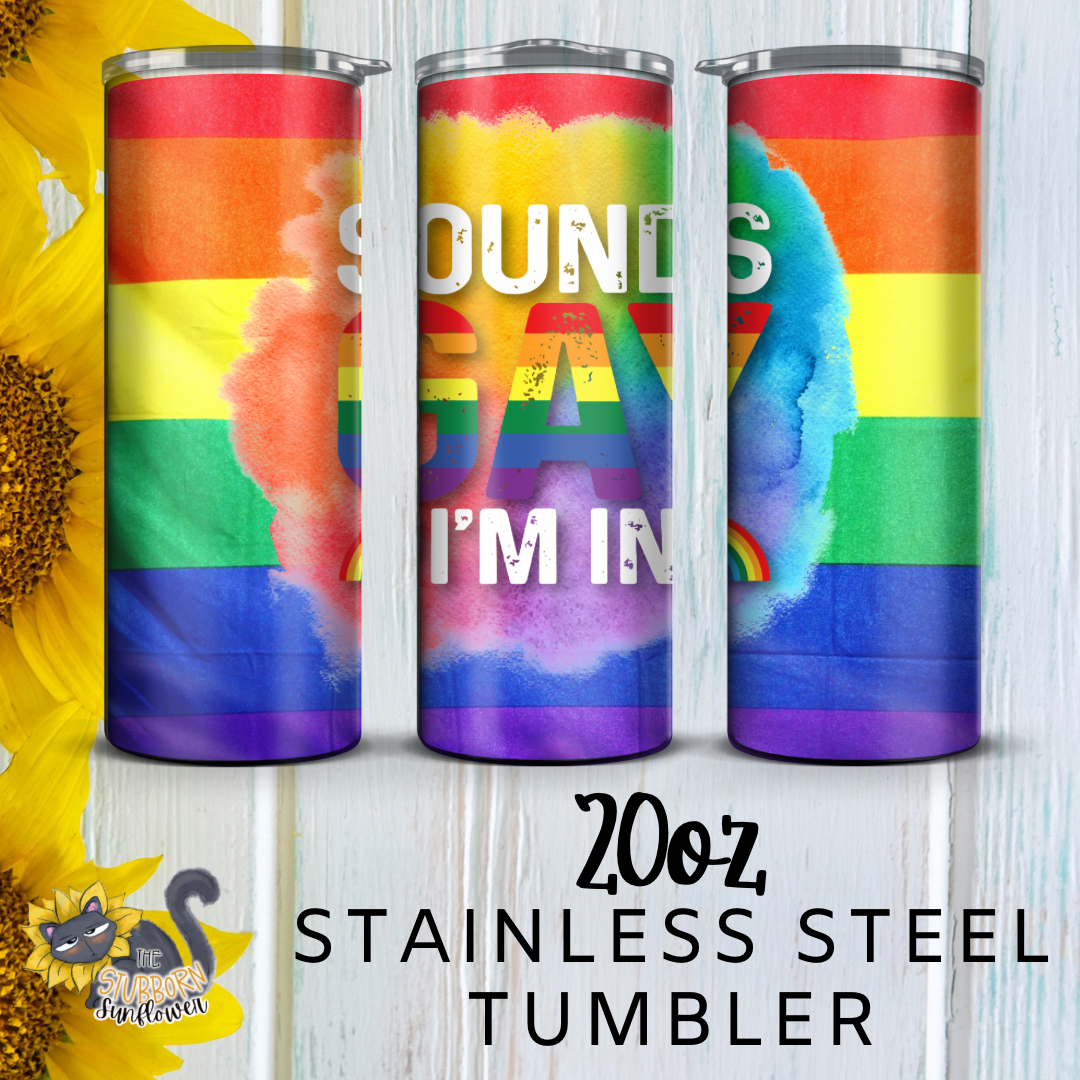 Quench your thirst with this playful 20 oz stainless steel tumbler featuring a witty phrase in slang, "Sounds gay I'm in". Perfect for keeping your drink cold and your mood fun, this tumbler is sure to make you smile (and maybe start a conversation or two).