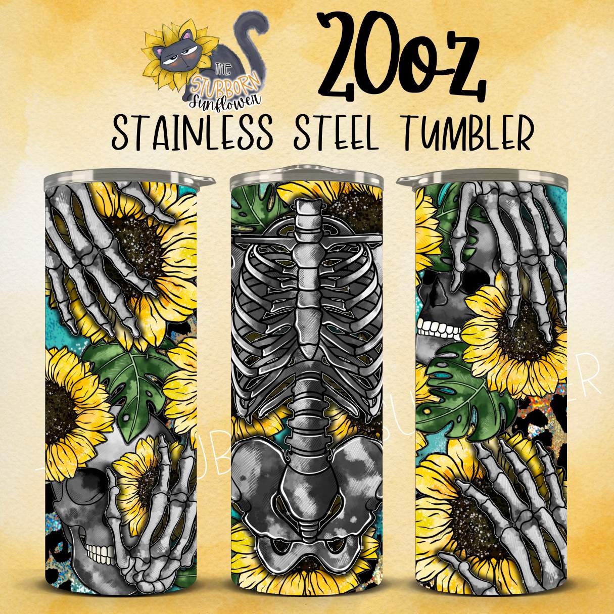 Enjoy your favorite beverage with this one-of-a-kind tumbler! Crafted from stainless steel, it features a vivid sunflower paired with a spooky skeleton. Add a unique touch to drinks on-the-go!