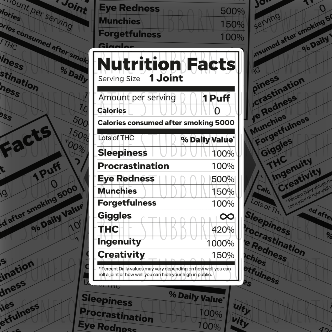 Make sure you know the "real" facts about joints with this hilarious Nutrition Facts Sticker! Choose from a holo or glossy finish-- evidence you take your consumption seriously. Enjoy a lighthearted look at the nutritional value of your favorite smokable!