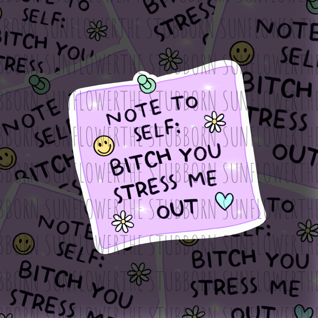 Add some humor to your life with our Note To Self Sticker. Featuring the message "bitch you stress me out," this funny sticker is available in both holo and glossy finishes. Stick it anywhere for a playful reminder to take it easy and not take yourself too seriously.