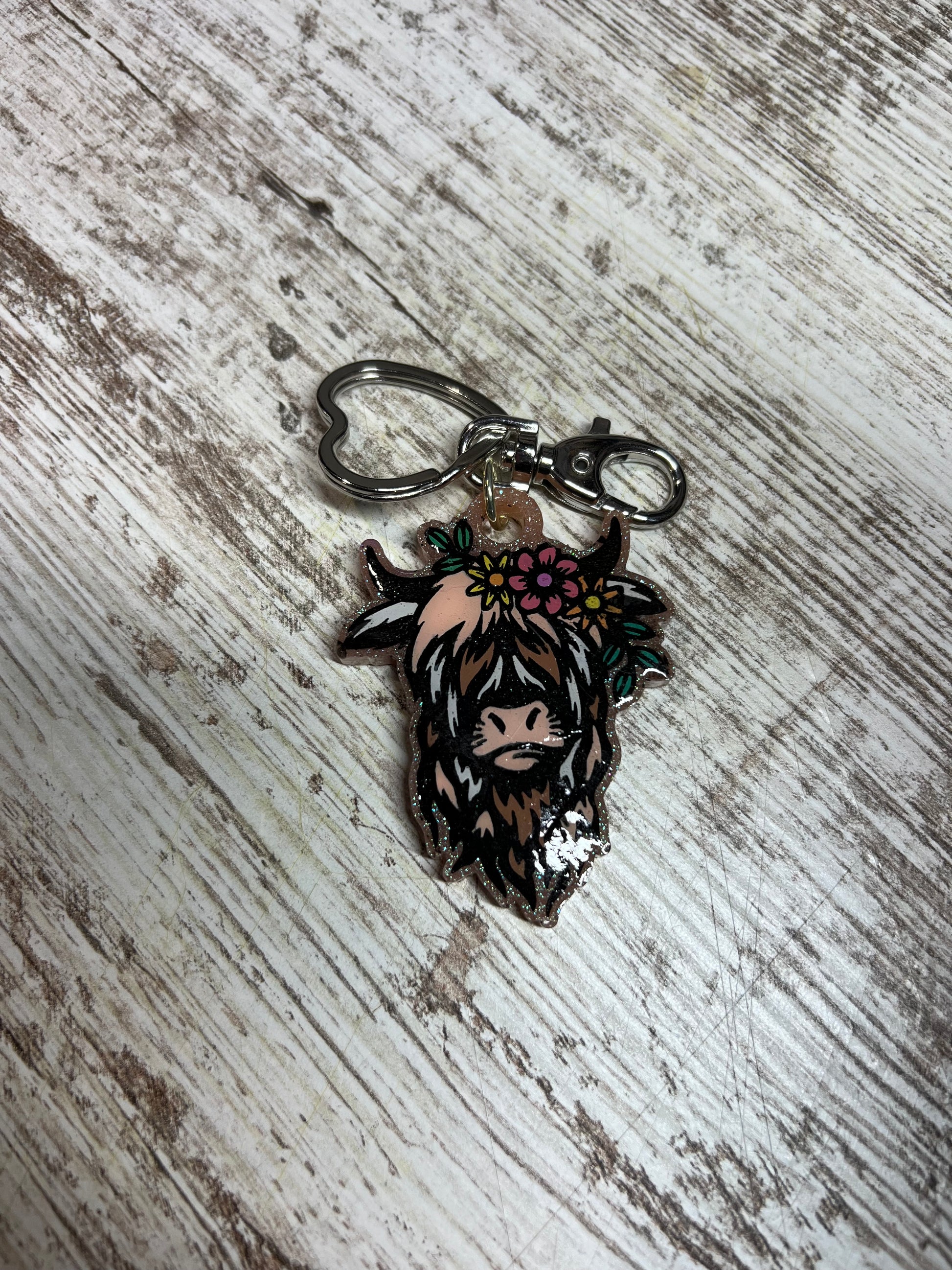 Introducing the Highland Cow Keychain! This playful, hand-painted resin keychain is sure to brighten up your day. From the farmer's market to your local bank, take this highland cow with you everywhere you go!