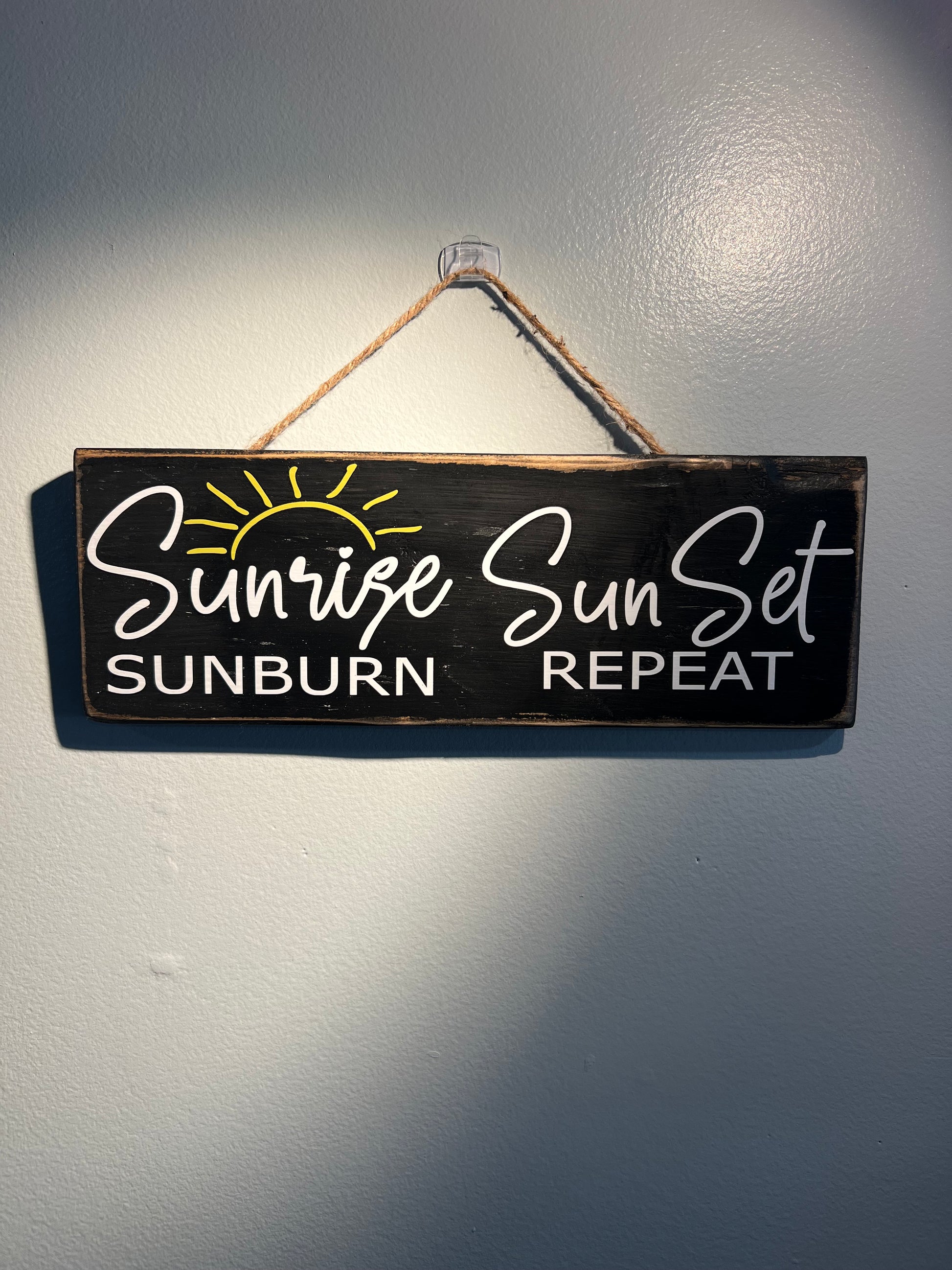 Add a little country flair to your home decor with this fun and unique Reclaimed Sunrise Sunset Sign! Made from recycled wood, it features the classic phrase "Sunrise, Sunburn, Sunset, Repeat" for a one-of-a-kind look. Let your walls rock with style!