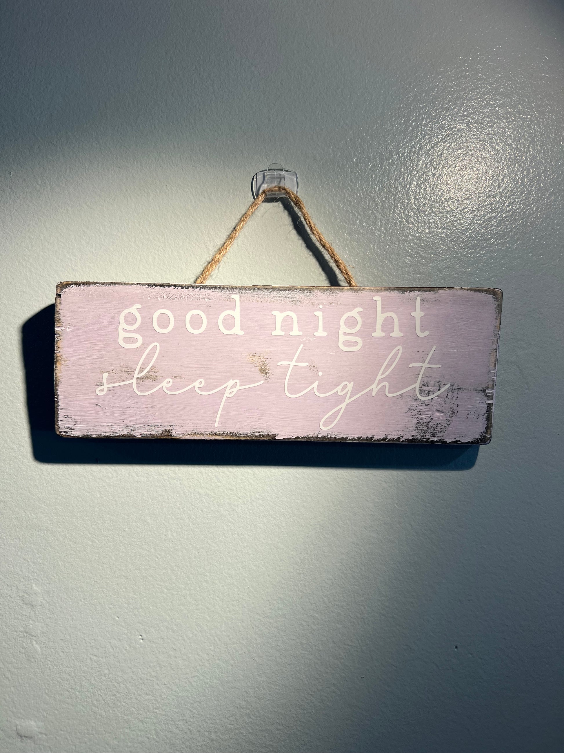 Say "Good Night" with a bit of rustic charm! This reclaimed wood sign is the perfect way to add a cozy touch to your bedroom. With its warm purple color and classic "Sleep Tight" phrase, you'll drift off to dreamland in style. Sweet dreams!