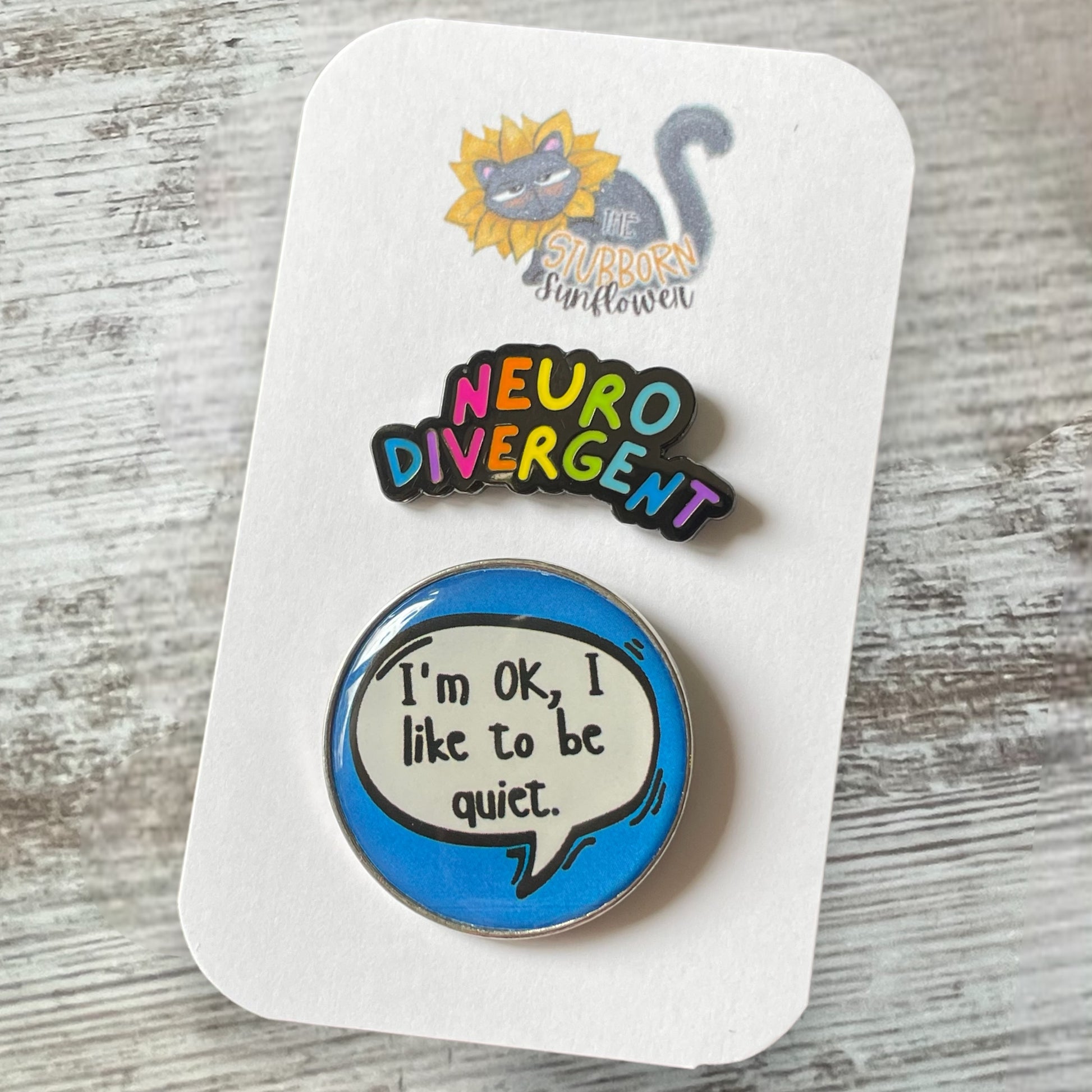 Quietly stand out with our Neurodivergent & Like To Be Quiet Pin Pack! These enamel pins are perfect for those who prefer to observe rather than participate. Show off your unique and quirky style with this fun and playful accessory. (Shhh, let your pins do the talking!)