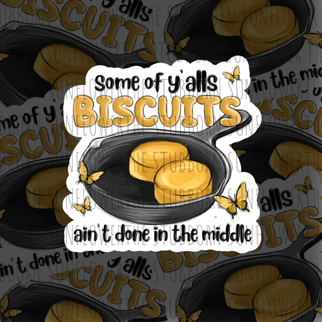 Add a little humor to your life with the Some Of Ya’lls Biscuits Sticker. This funny sticker features a doughy biscuit with the message "Some of ya’lls biscuits ain’t done in the middle." Choose between a glossy or holo finish for an extra pop. (Dough-n't miss out on this sticker!)