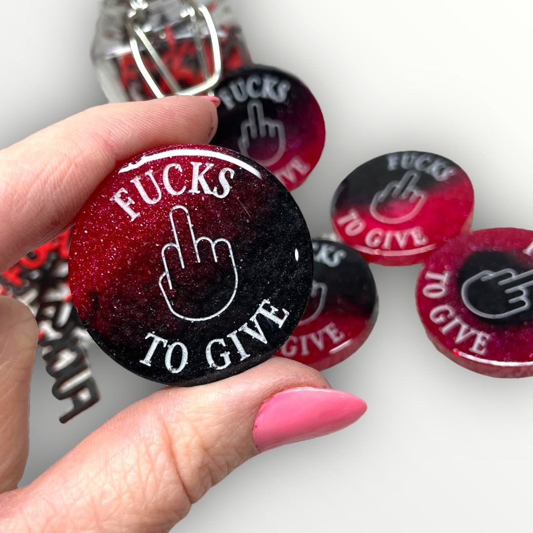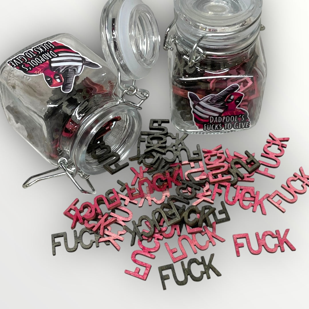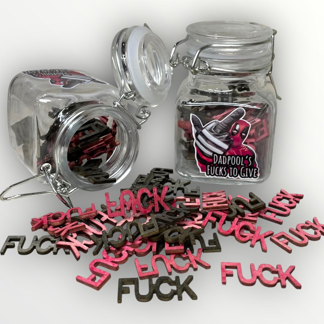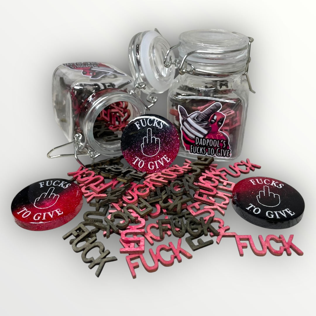Lighten the mood with The Official Dadpool’s Fucks To Give! Choose from a glass jar filled with red and black hand painted wooden fucks, or a hand poured red and black Fuck to Give resin token. (Warning: contains limited fucks, use wisely!)