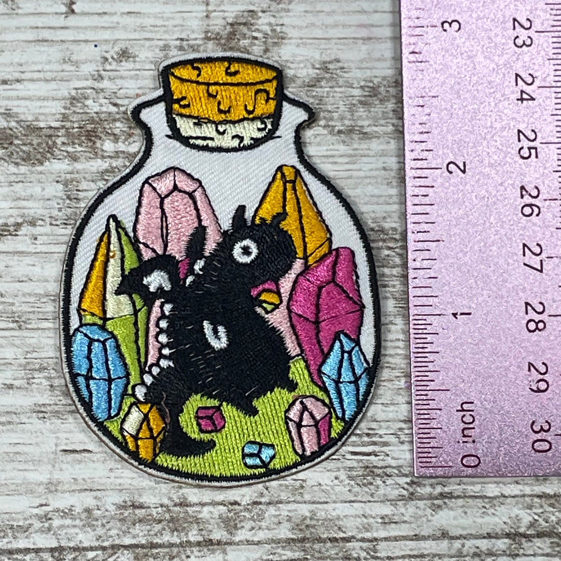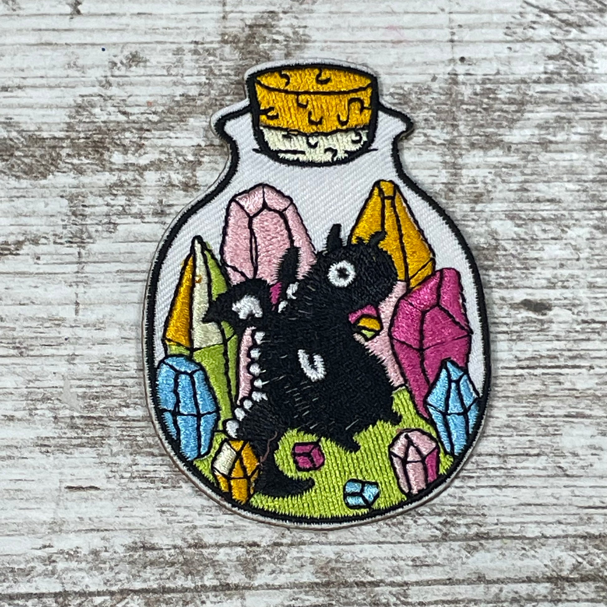 Transform any boring tote bag or jacket into a statement piece with the Dragon & Gem Jar Patch! This iron on patch features a cute dragon and colorful gems in a jar, adding a touch of whimsy to any outfit. Revamp your wardrobe and show off your playful side with this unique accessory.