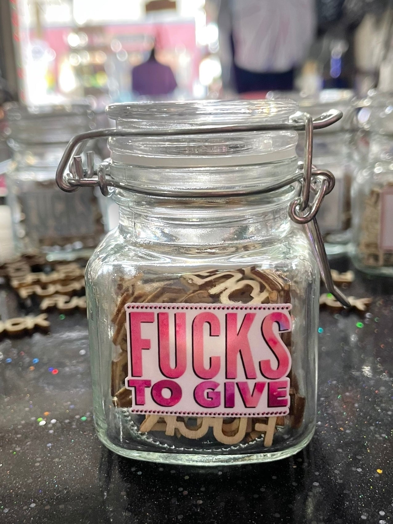 Lighten the mood with our Fucks To Give Jars. Filled with wooden fucks, this humorous gift is perfect for those who don't take themselves too seriously, or for yourself for when you need a fuck to give. (Warning: contains limited fucks, use wisely!)