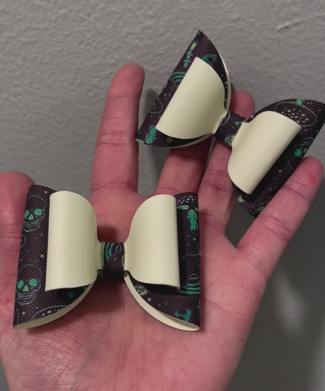 This hair bow is the perfect addition to any funky outfit! It's handcrafted from faux leather and features a glow-in-the-dark skull and mushroom design. Bring some cool and quirky vibes to your look with this fun accessory!