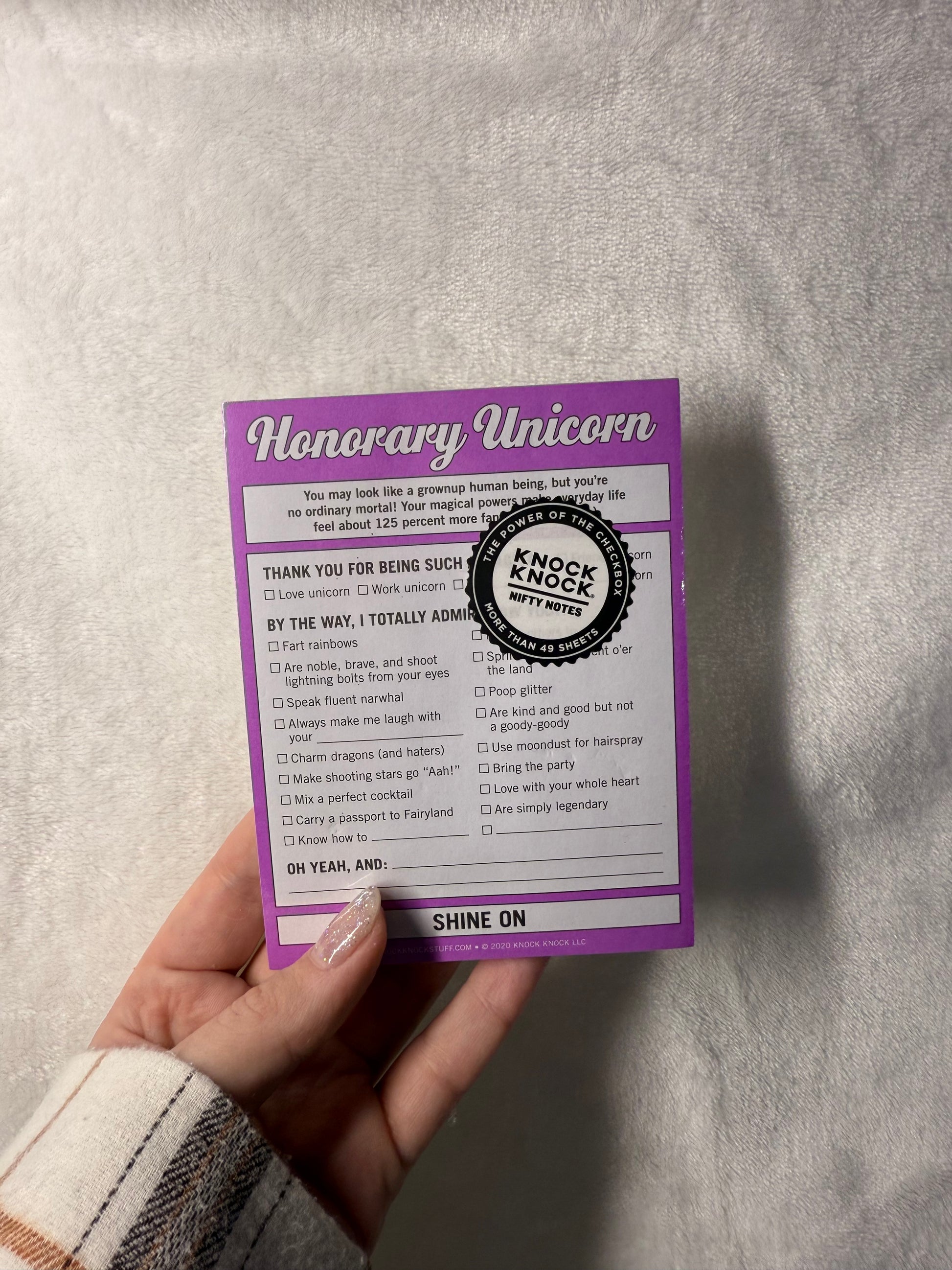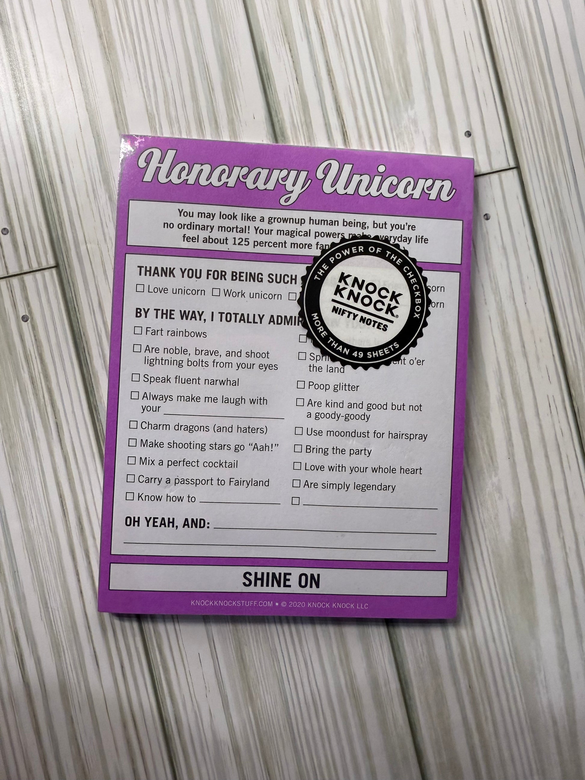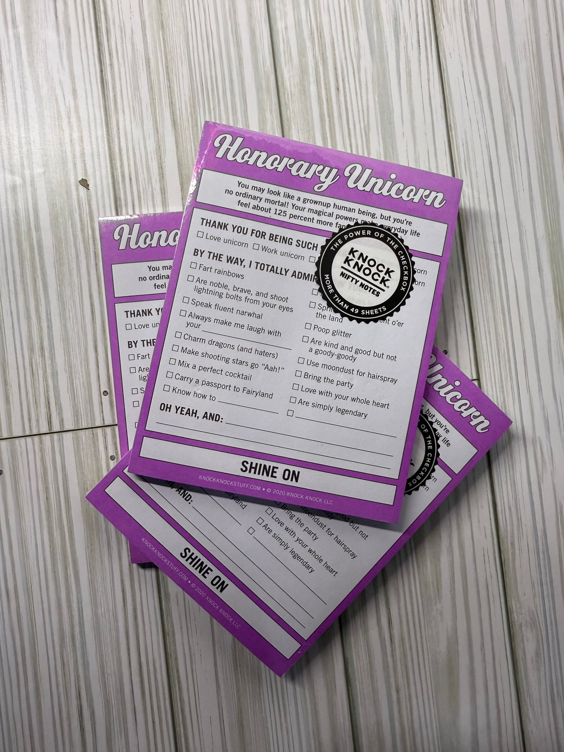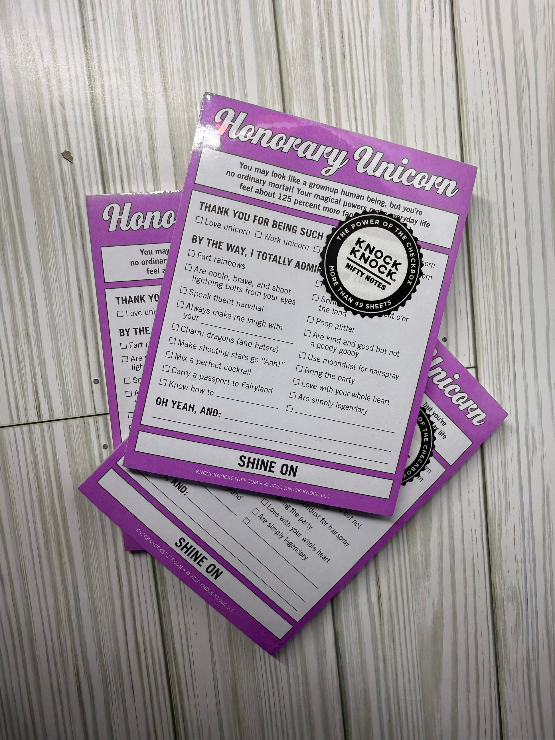 Calling all honorary unicorns! These funny notepads are perfect for jotting down all your magical thoughts and ideas. Choose from a variety of fun reasons why you deserve the title of an honorary unicorn. Keep your notes organized in a quirky and playful way with these notepads.