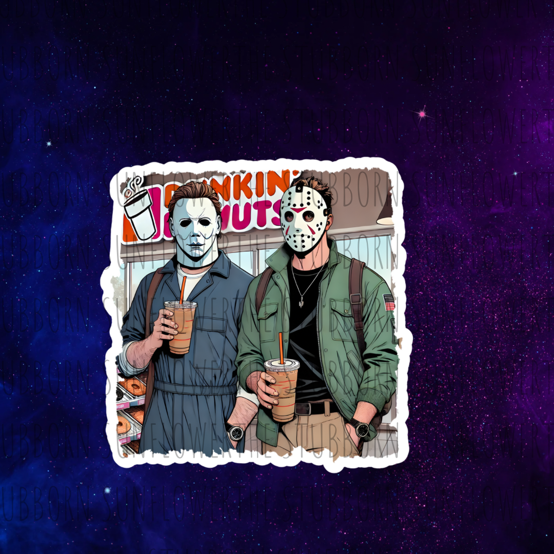 Add a spooky touch to your morning routine with this horror-themed sticker featuring guys enjoying their morning cup of joe. Give your laptop, water bottle, or notebook a glossy finish with this unique and playful sticker. Perfect for horror fans and coffee lovers alike!