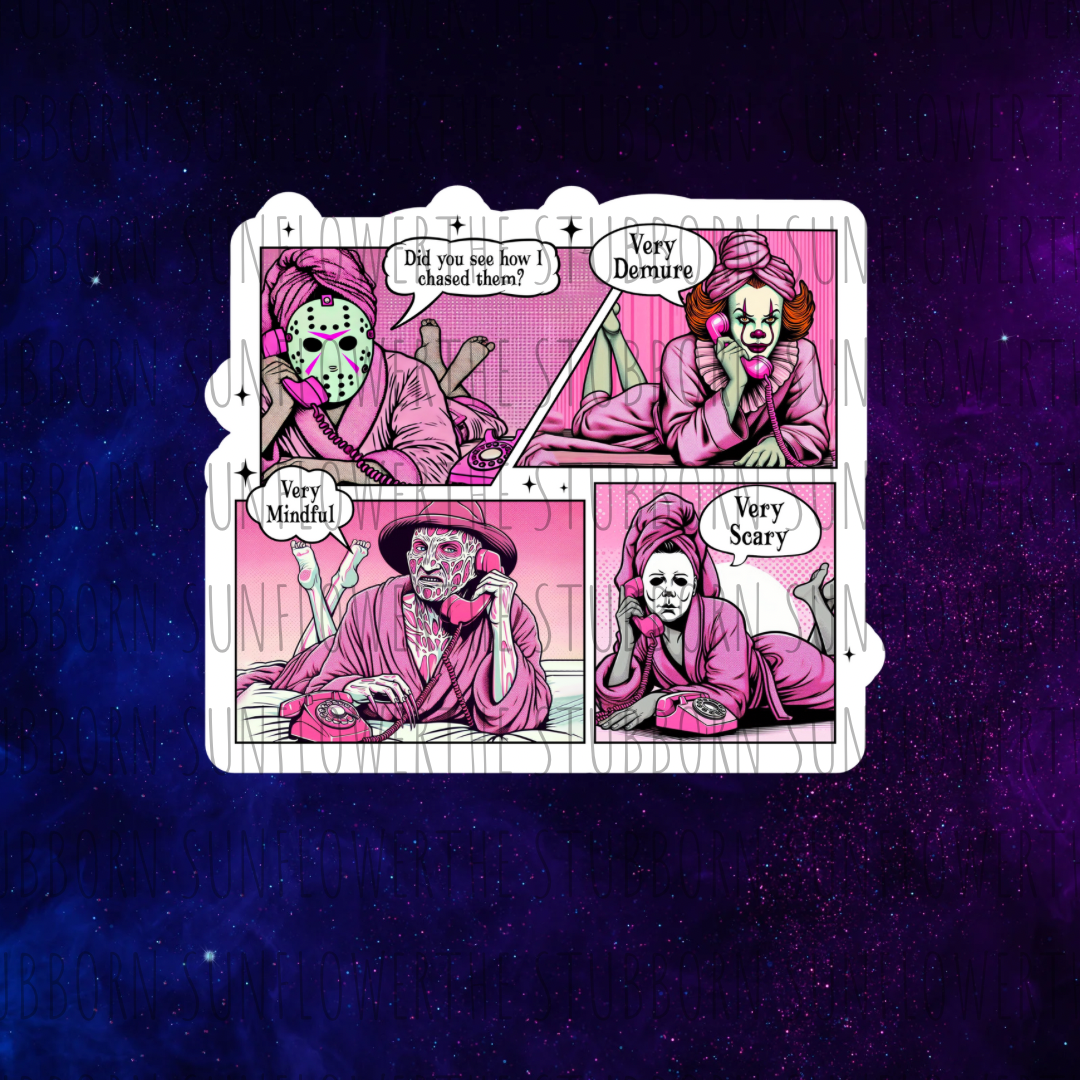 Unleash your wild side with Horror Guys Demure Sticker. These guys may be horror-themed, but they're surprisingly mindful and funny. Add some quirkiness to your belongings with this playful sticker!