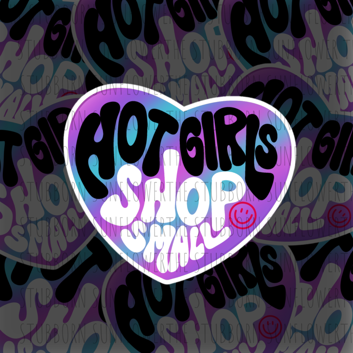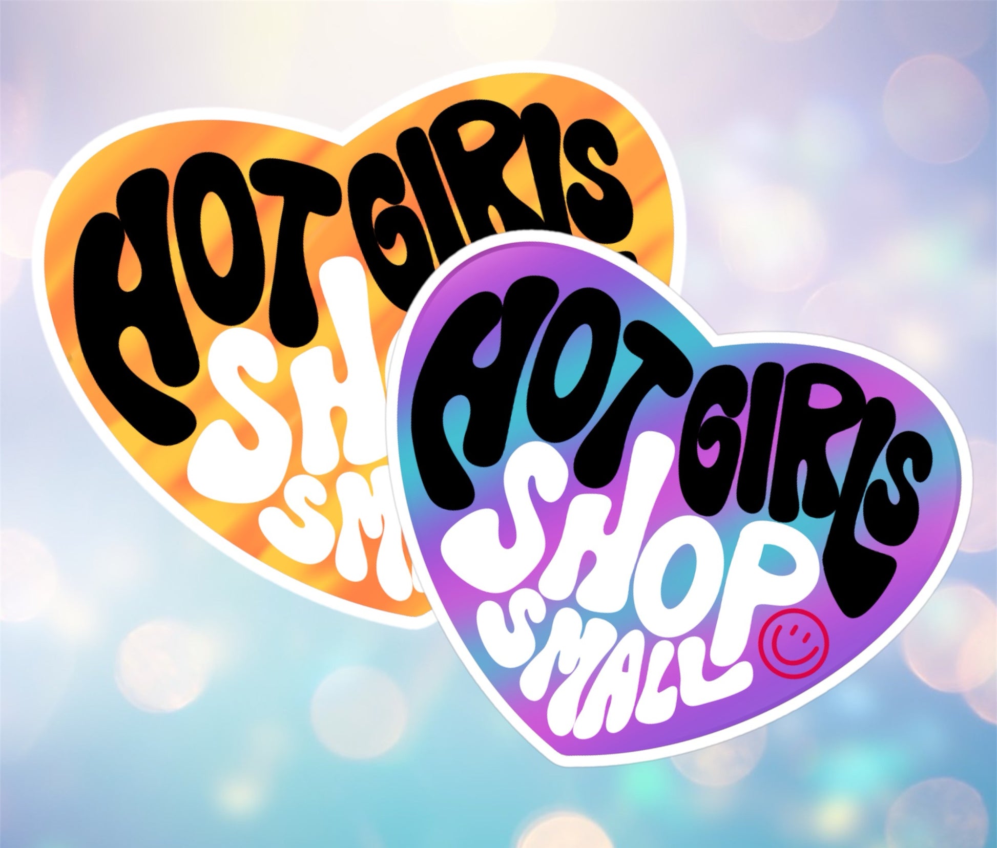 Add some playful flair to your laptop or water bottle with our Hot Girls Shop Small Stickers! Whether you choose the vibrant orange or the bold purple, the glossy or holographic finish will make them stand out. Embrace your love for supporting small businesses while keeping your style fresh.