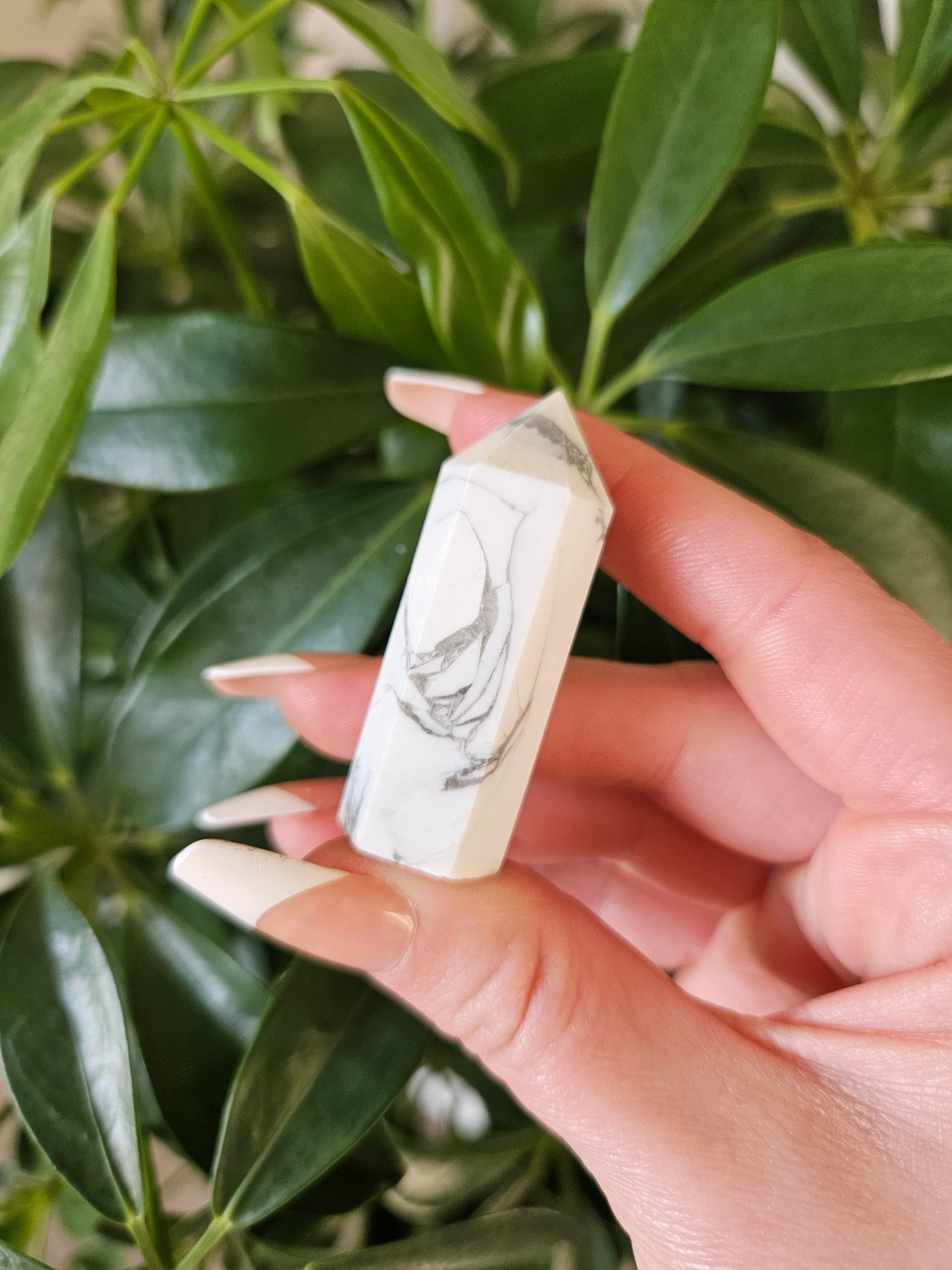 Howlite mini tower is 1.75in tall and 3/4in wide. Includes bright white coloration with grey veins.