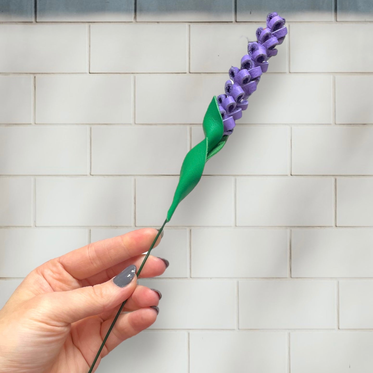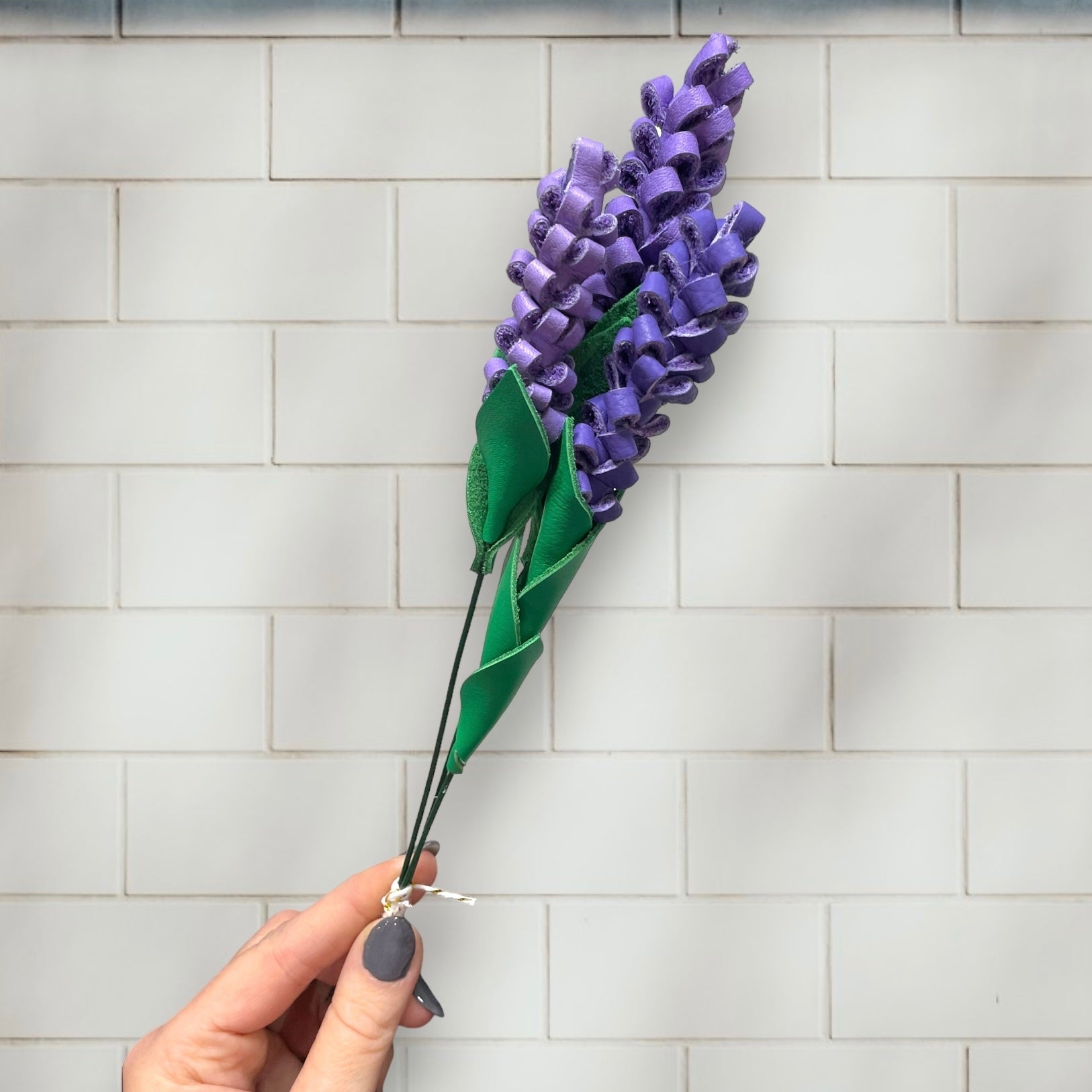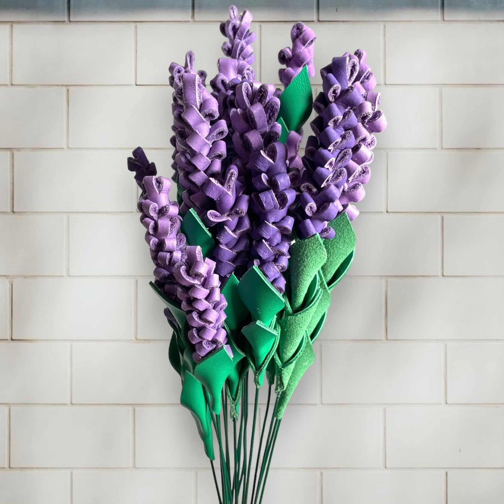 Gather all the attention with these Leather Lavender flowers - handcrafted with soft purple leather and 18” metal wire stems. Pick one for yourself or pick a bundle of three or five flowers for that special someone. Show your love and appreciation in Lavender!