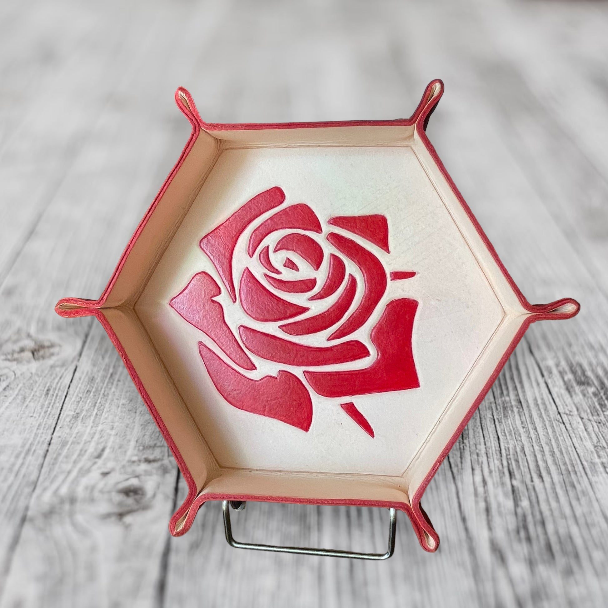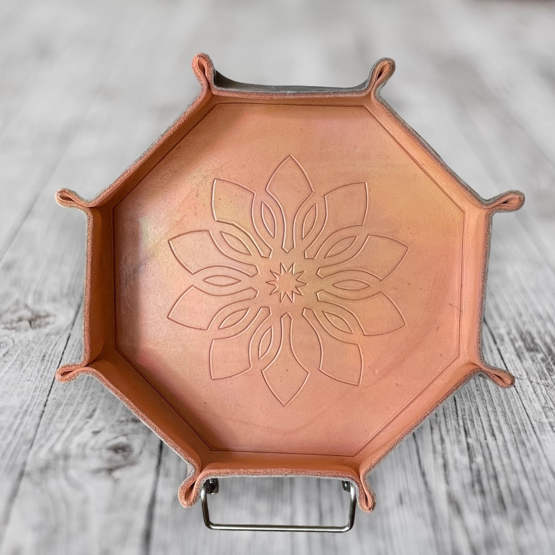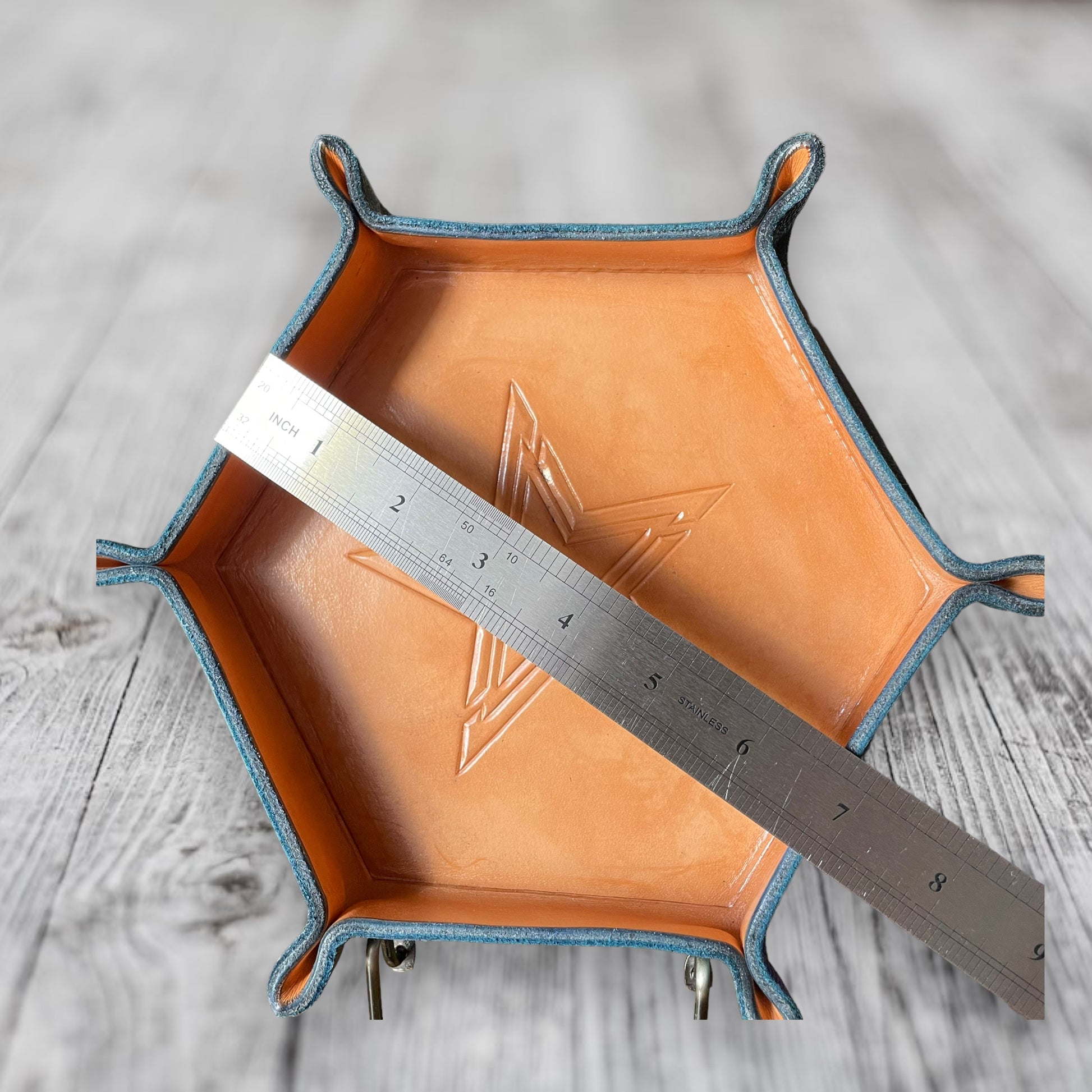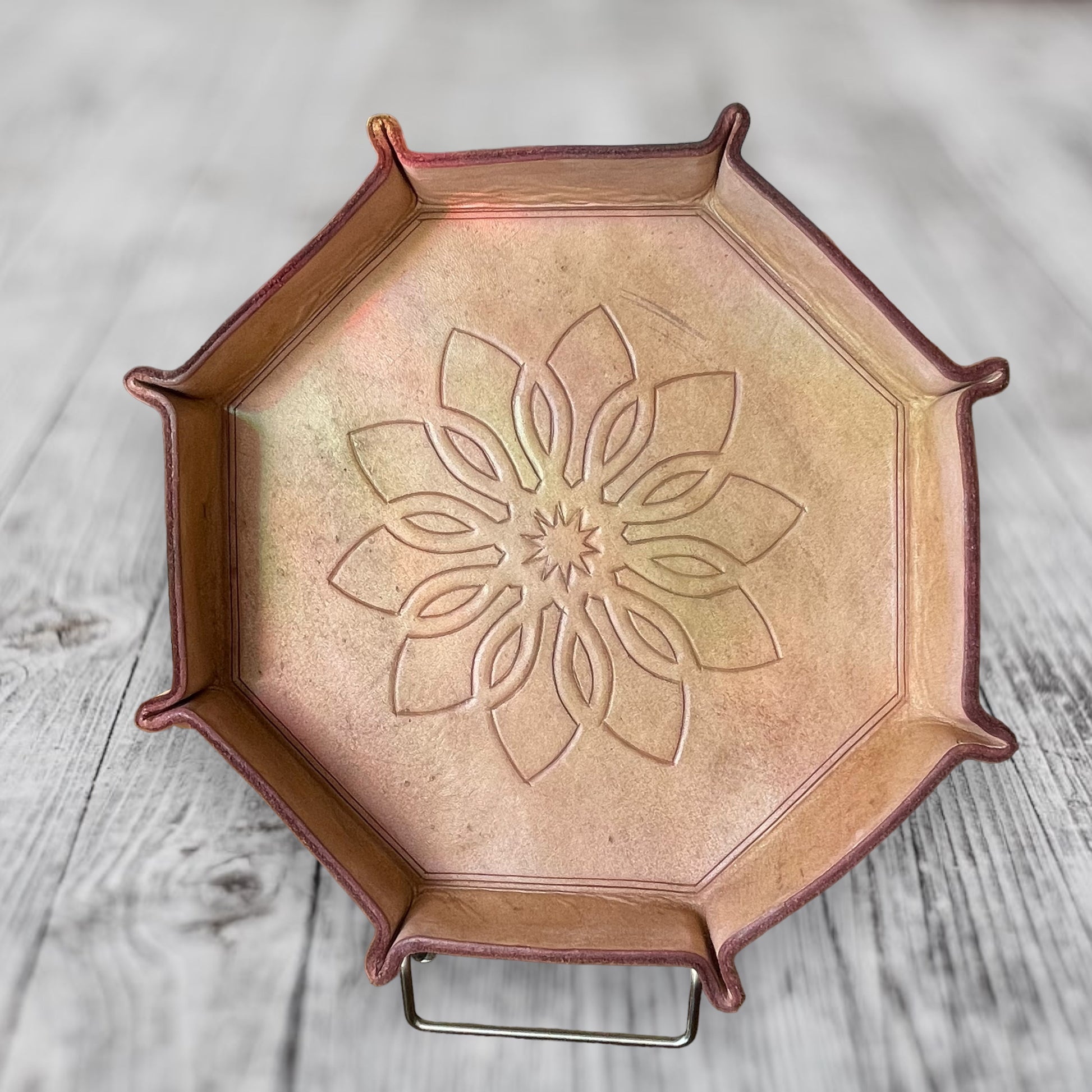 Each tray is one of a kind, with high quality leather that has been hand cut, formed, and painted, courtesy of John’s Garage Leather out of South Carolina.