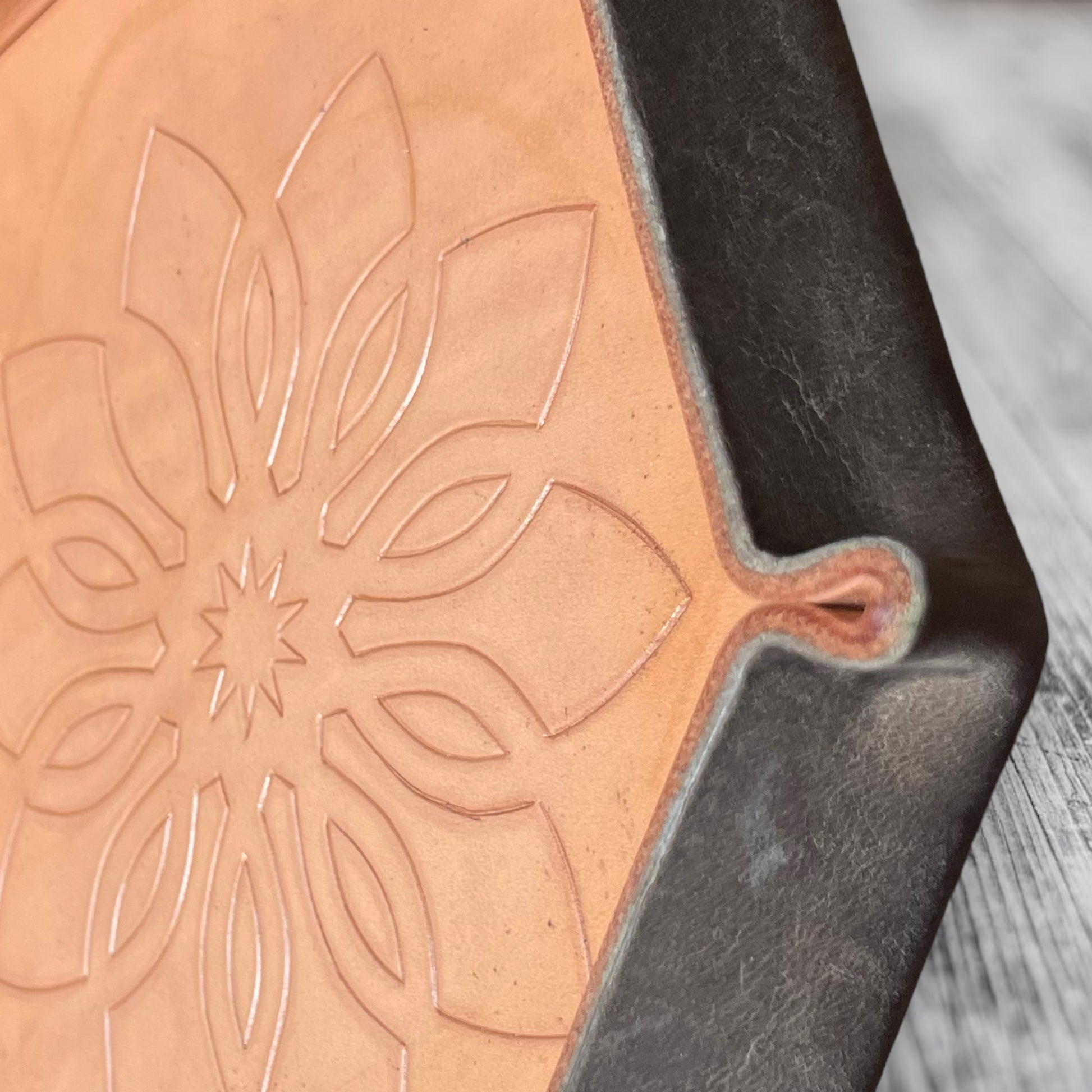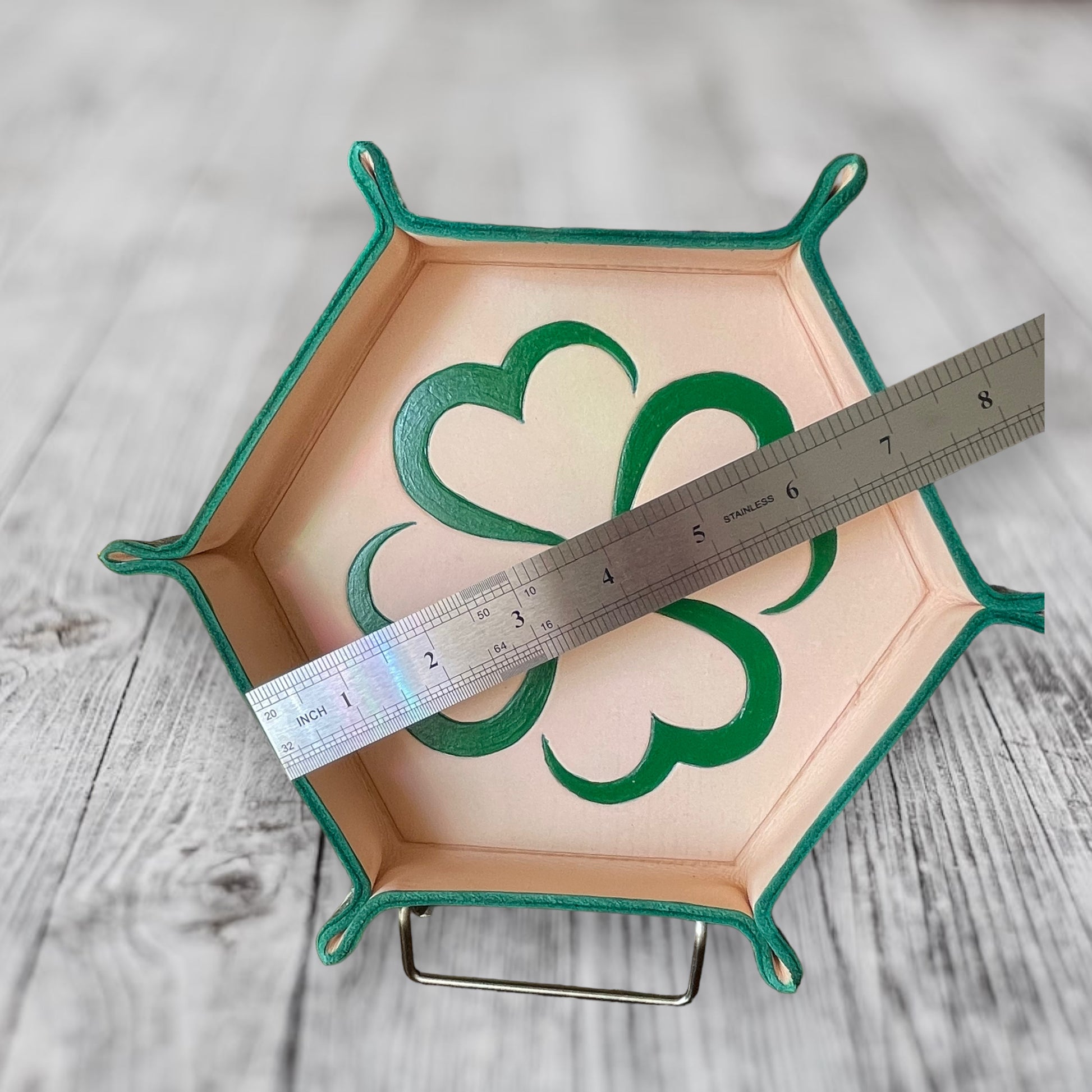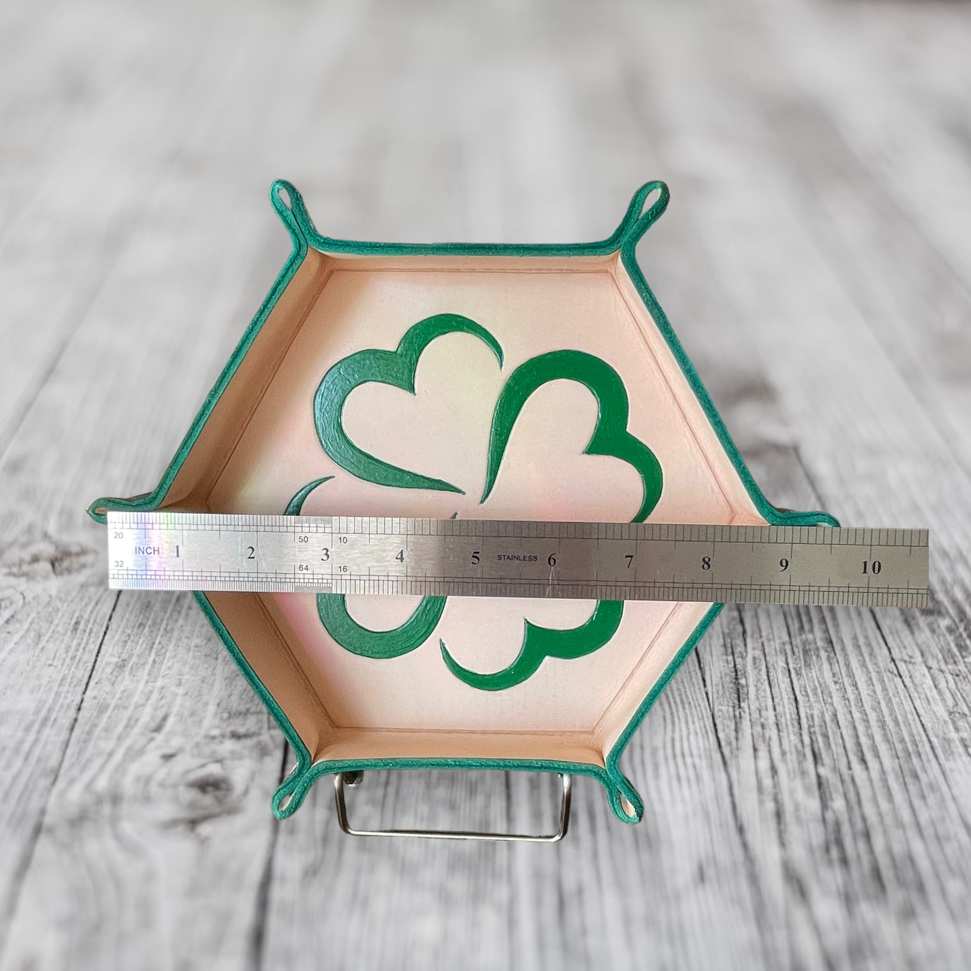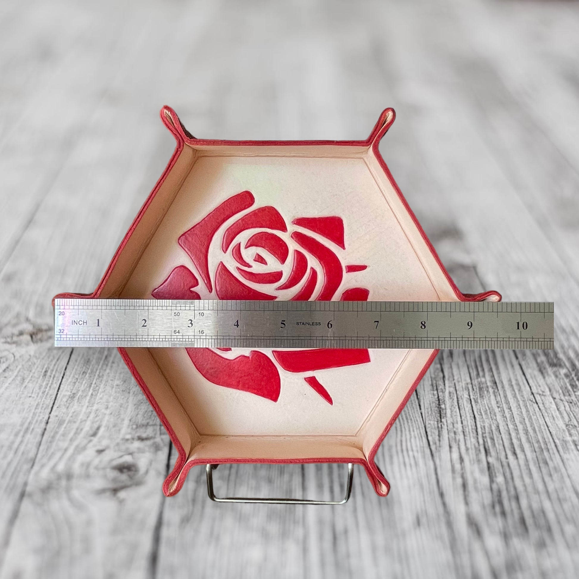 Each tray is one of a kind, with high quality leather that has been hand cut, formed, and painted, courtesy of John’s Garage Leather out of South Carolina.