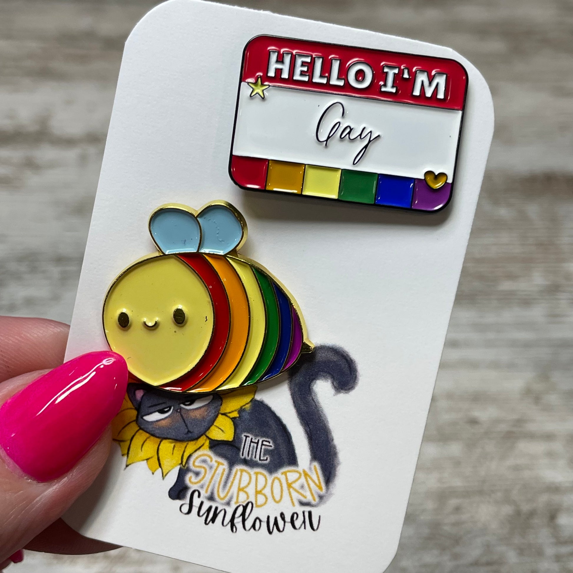 Add a pop of color and inclusivity to any outfit with our LGBT Bee & Pronoun Pin Set. Made with durable enamel, these pins are the perfect way to show your support for the LGBTQ+ community and your pronoun preferences. Express yourself and spread love with this playful and stylish accessory set.