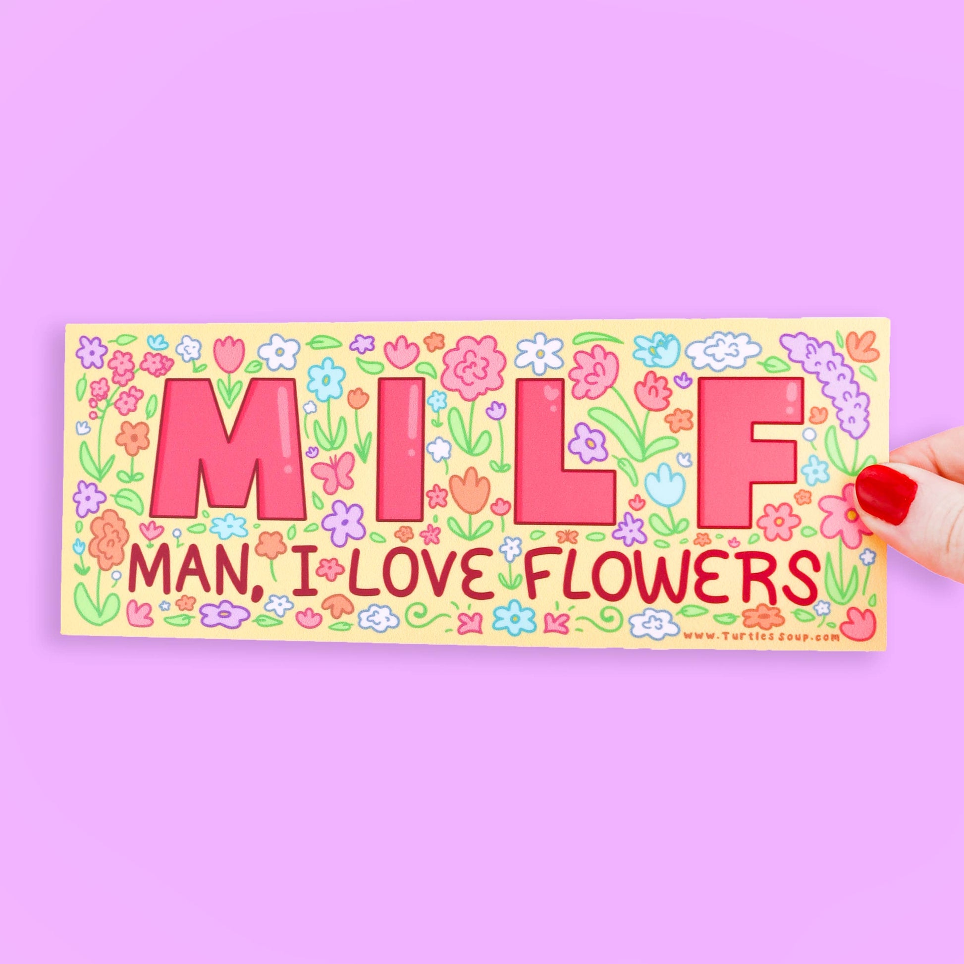 'Man I Love Flowers' vinyl bumper sticker by Turtle's Soup. 🐢 Deck out your daily driver with our new line of fun bumper stickers! Each one is sized at approximately 3 inches by 8 inches and makes a perfect addition to your vehicle. 🐢 Our Turtley Awesome vinyl stickers are made from the highest quality ingredients on the market! Printed on thick, ultra-durable vinyl, these stickers are made to last. They're UV-coated making them waterproof, weatherproof, and dishwasher safe! 🐢