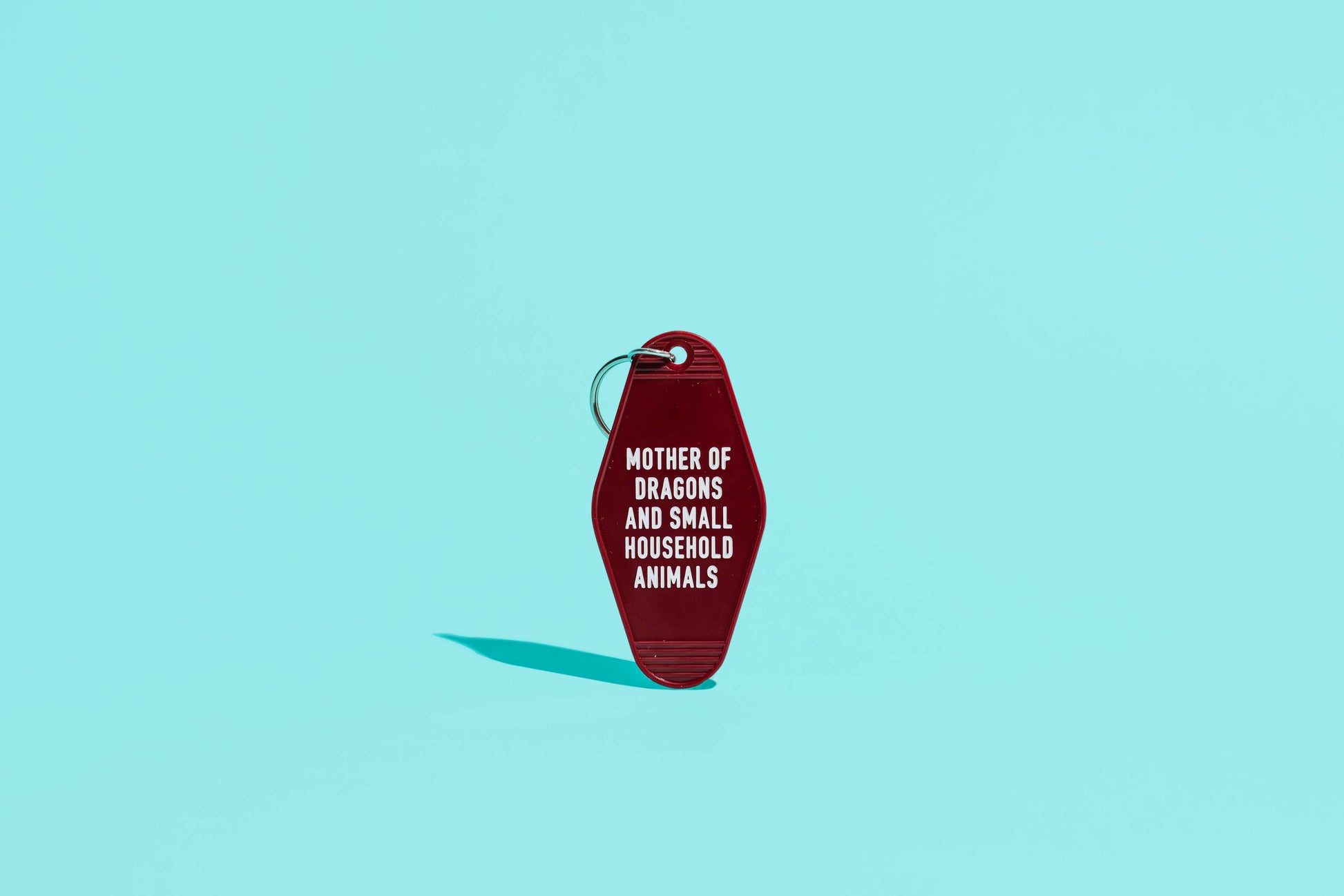 Dark red keychain with white lettering reads "MOTHER OF DRAGONS AND SMALL HOUSEHOLD ANIMALS" in classic motel style design. She's the mother of dragons... and a few random cats and dogs. Call her Daenerys Terrier-garyen, or Daenerys Purrrrgaryen. ๐