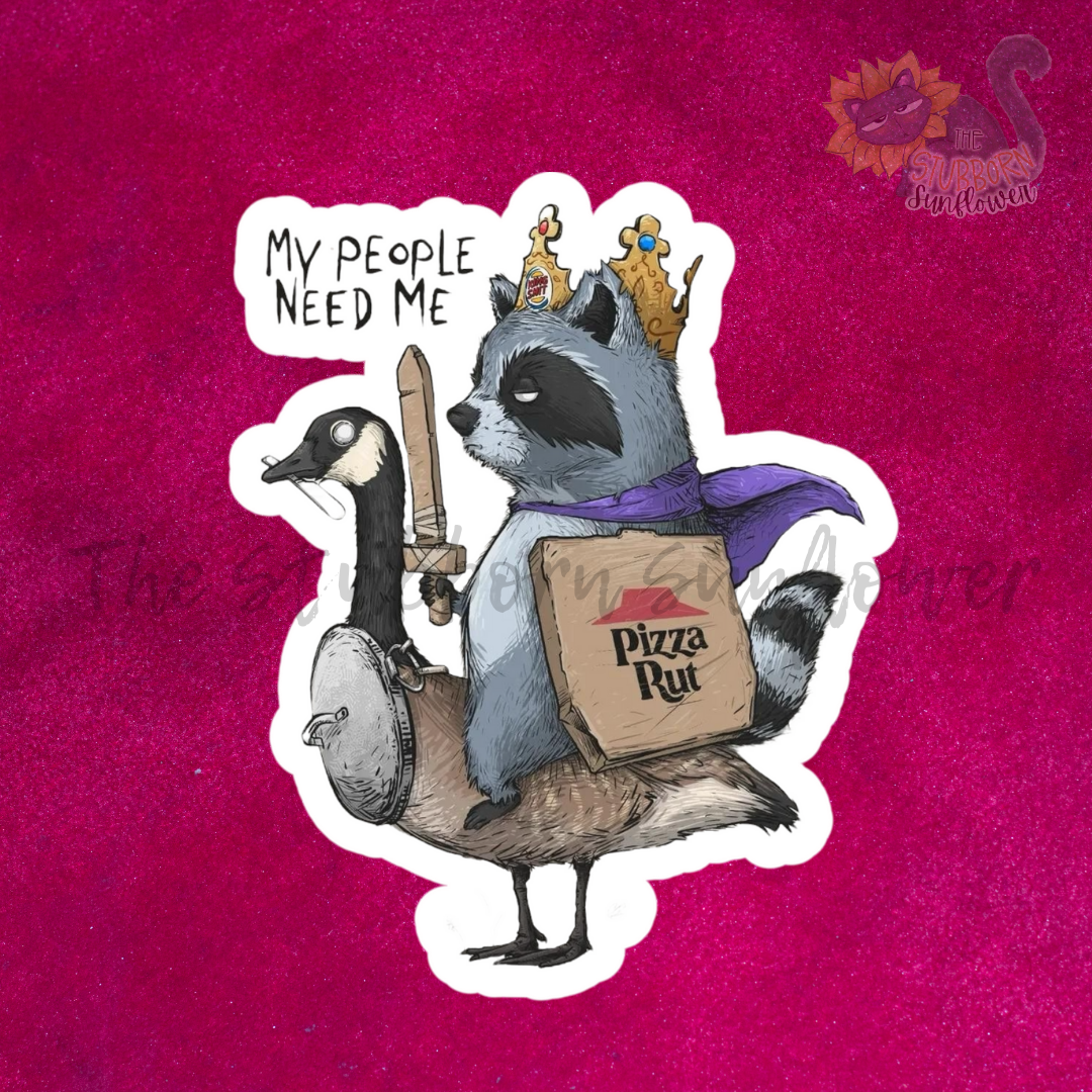 Stand out from the crowd with our "My People Need Me" sticker featuring a trash panda riding a goose. Let everyone know that you are the ultimate savior and guardian of your people. A playful and quirky addition to any sticker collection.