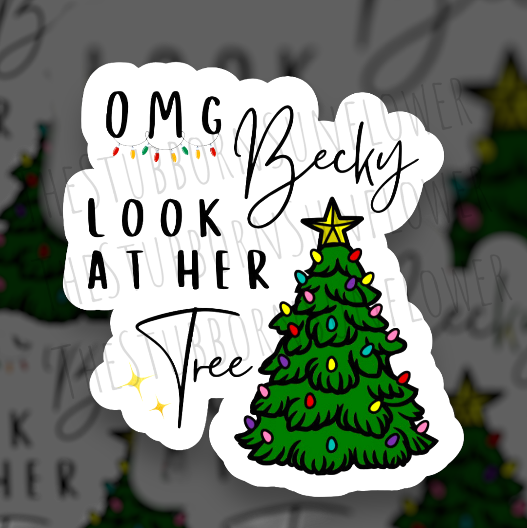 Spread holiday cheer with this OMG Becky Look At Her Tree funny holiday sticker! Make everyone chuckle with the hilarious double-entendre, and get your tree extra attention. It's a surefire way to get a giggle out of your family and friends!