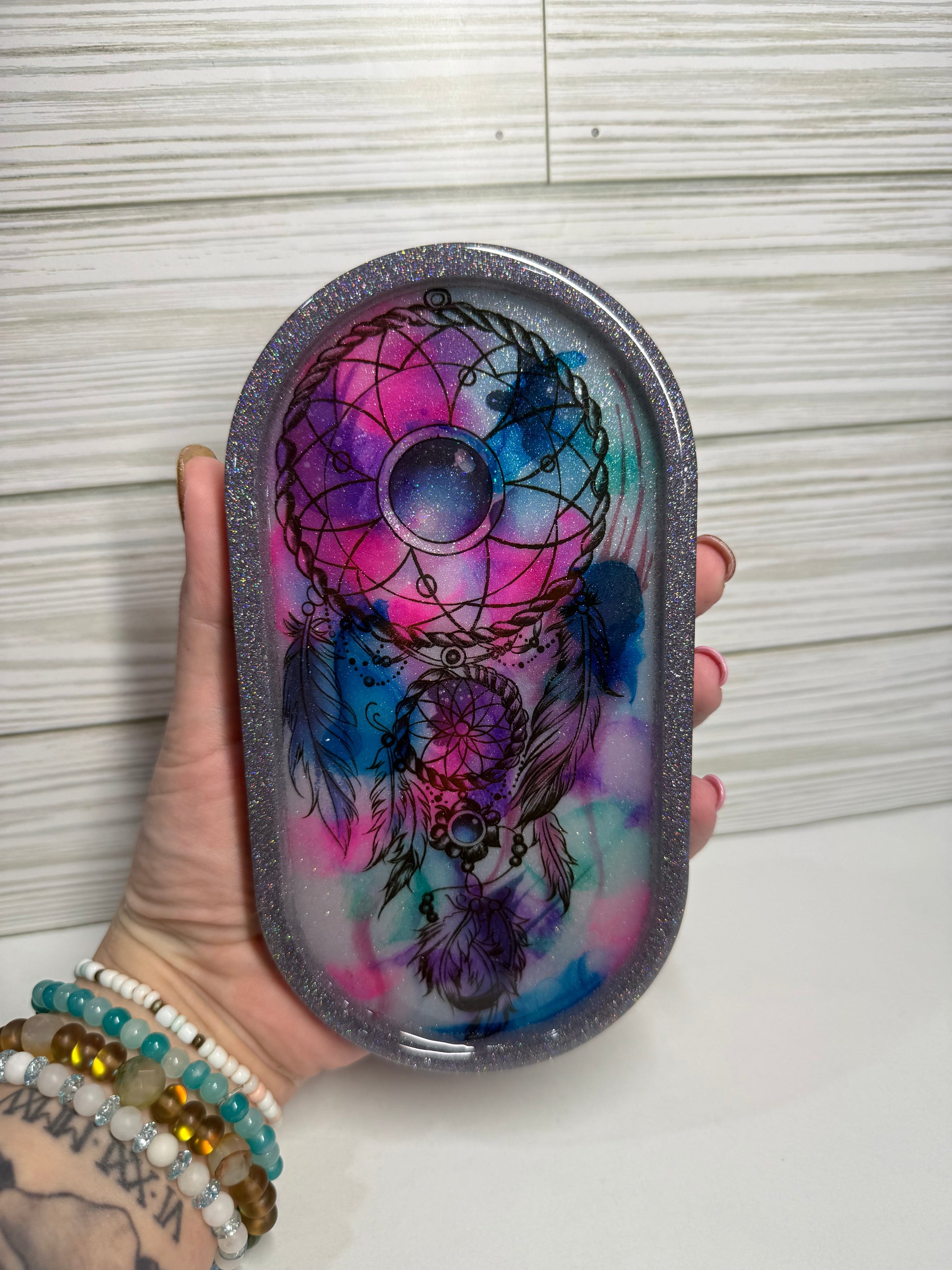Elevate your home decor with our Oval Watercolor Dreamcatcher Tray. Handpoured in resin, this tray features a stunning watercolor design and a dreamcatcher motif. Perfect for holding small items or as a decorative piece, this tray adds a touch of whimsy to any room. (Dreamy, colorful, and functional!)