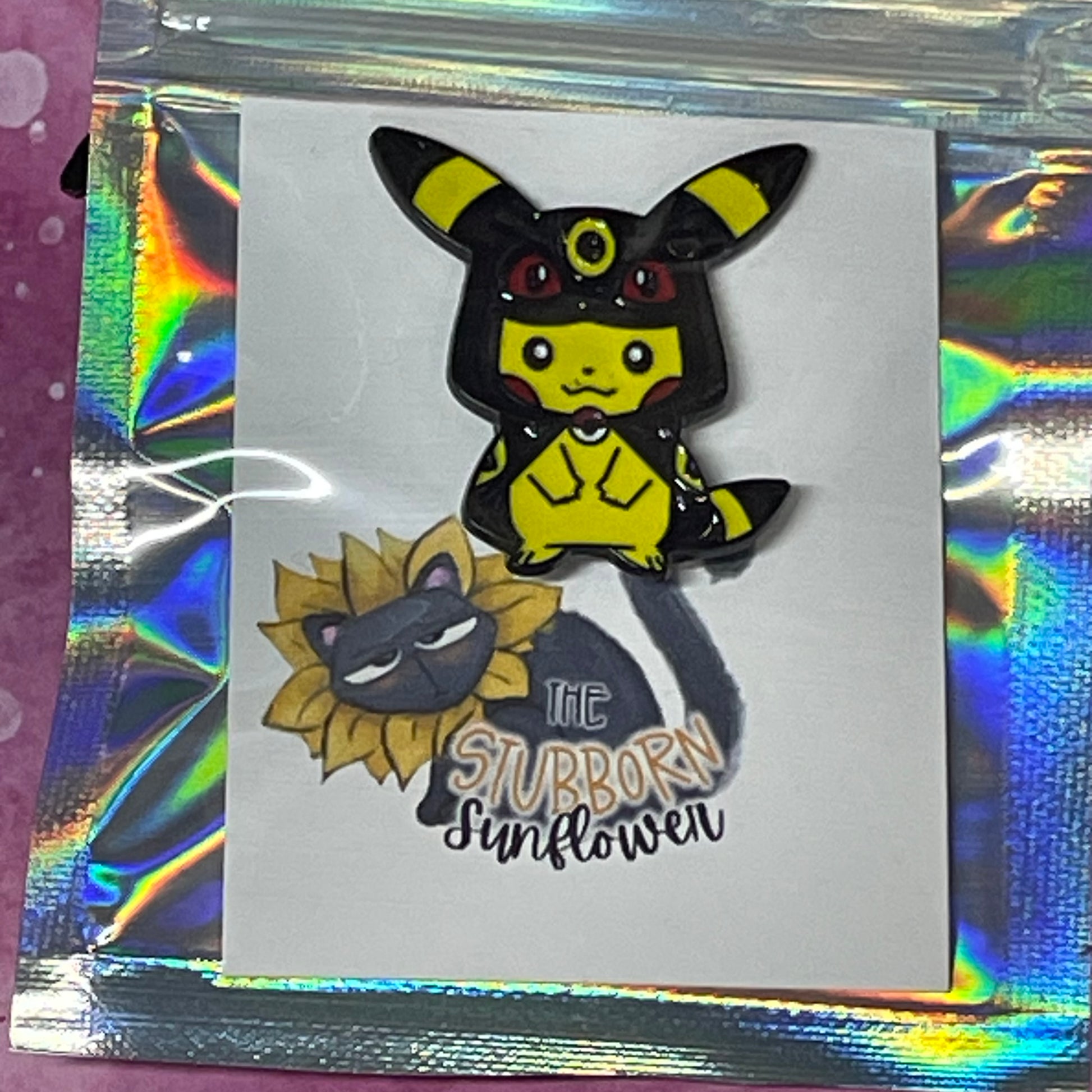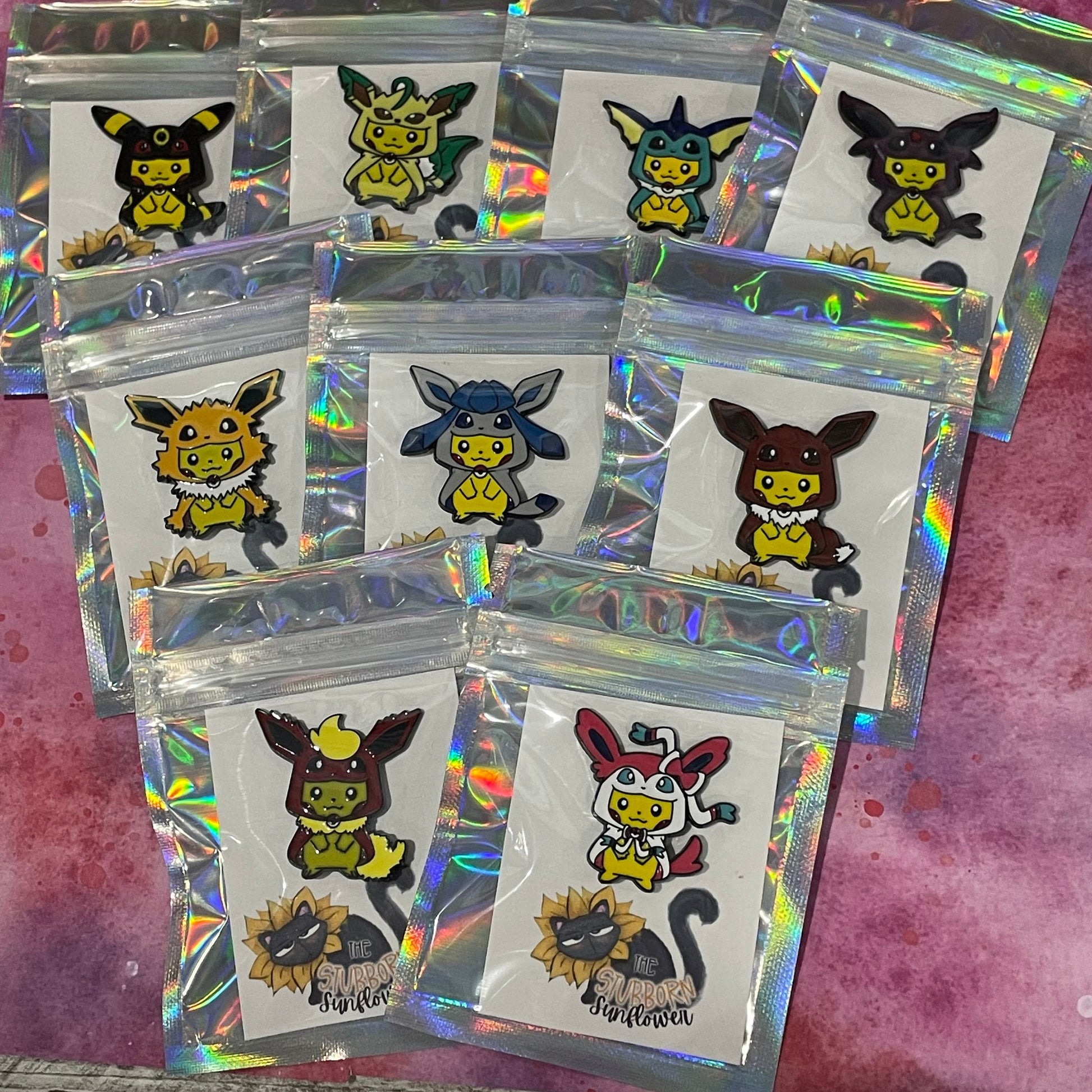 Introducing the cutest pin ever - Pikachu dressed in Eevolutions! Perfect for adding a touch of fun to any outfit, this pin is bound to make everyone's day a little brighter. Collect them all and show off your love for this electrifyingly adorable Pokemon!