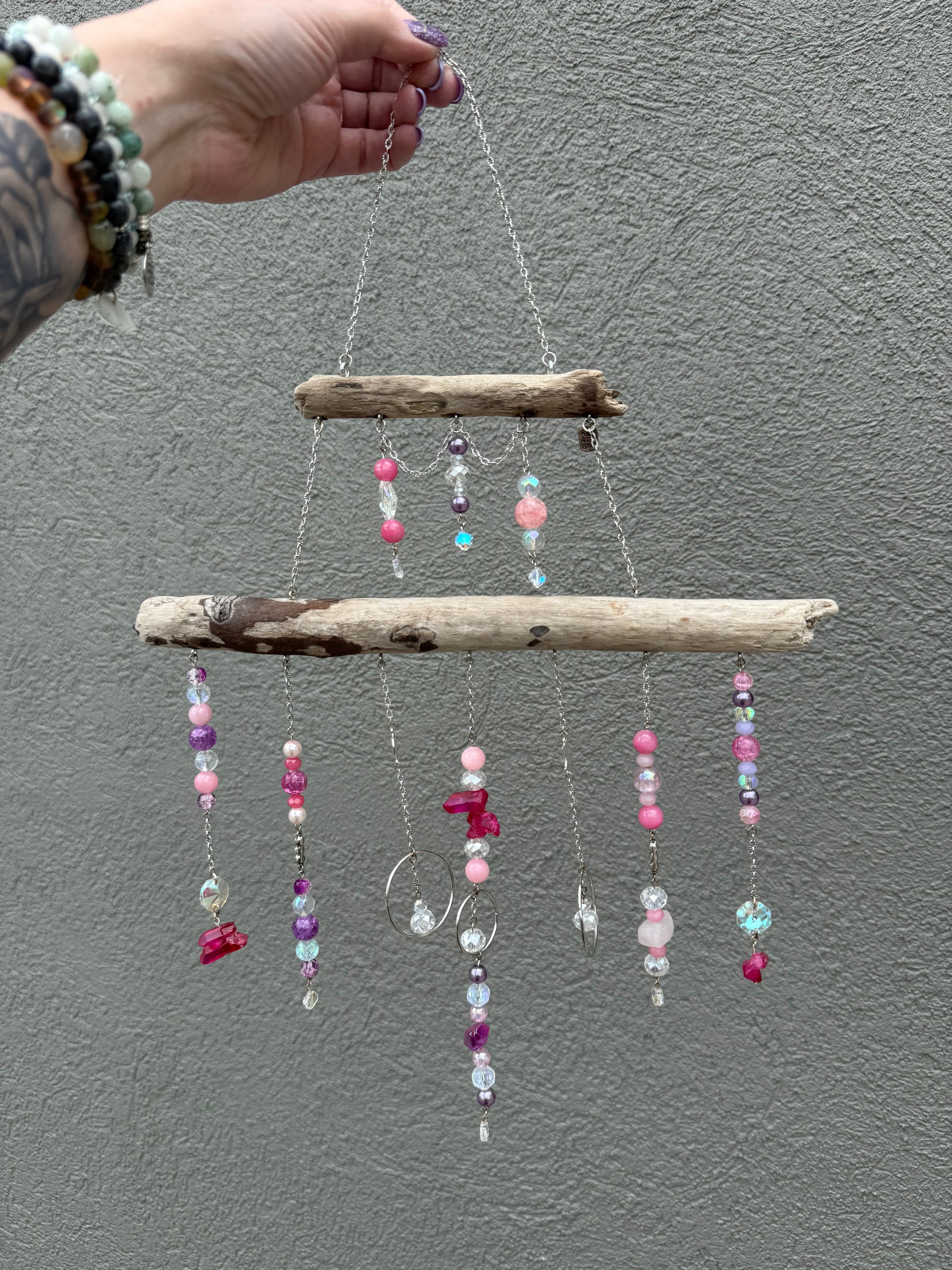 Add a pop of color to your home with our Pink Driftwood Suncatcher! This beautiful piece is crafted with glass beads and crystals, creating a stunning shimmer in the sunlight. Bring a touch of whimsy to any room with this unique and playful home décor item. (Warning: may cause excessive daydreaming).