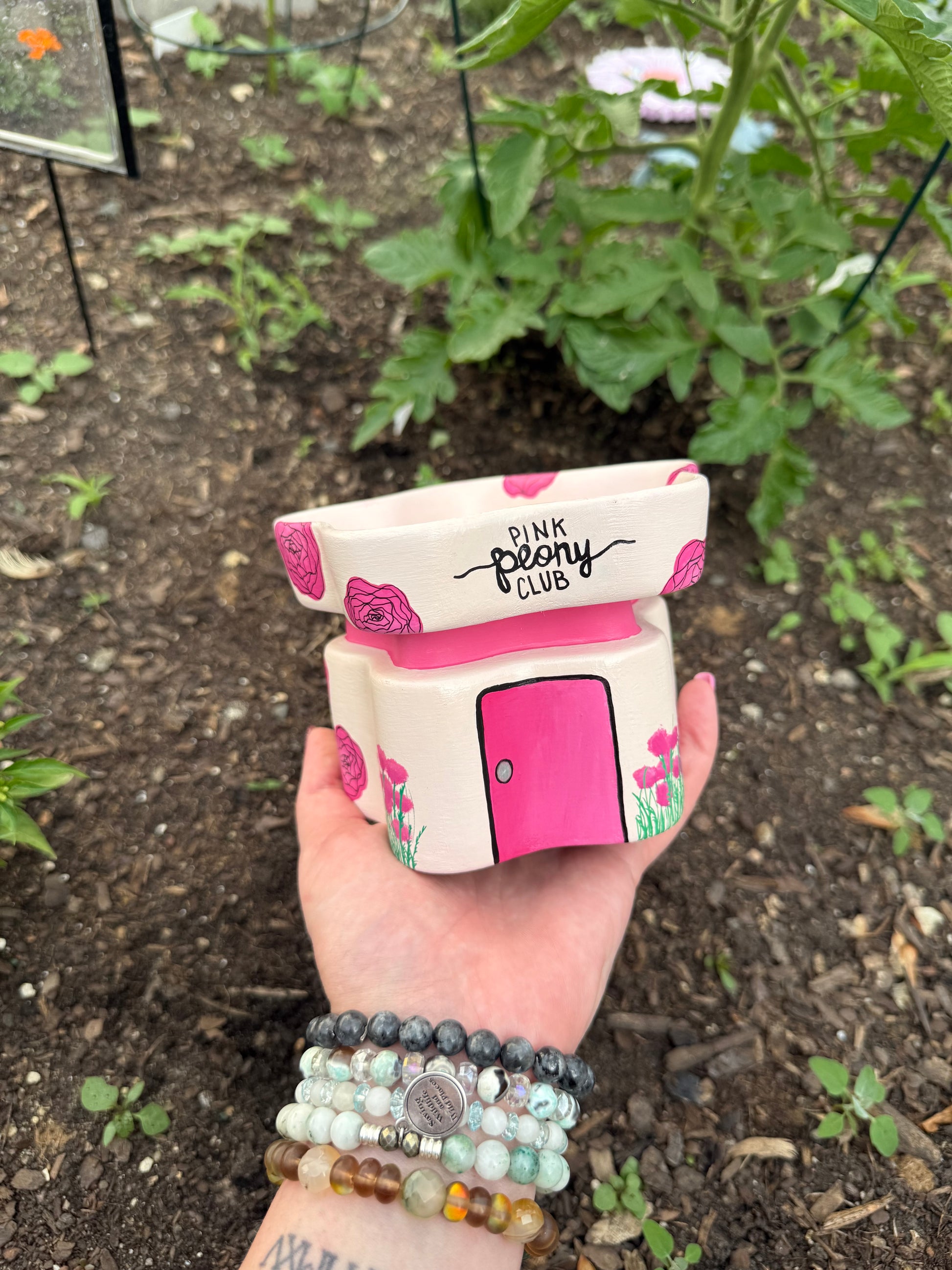 Add a touch of whimsy to your garden with our Pink Peony Garden Bee Bath! Simply place it in your garden and fill it while watering your plants to provide a refreshing spot for bees to drink. Help support your local pollinators while adding charm to your outdoor space!