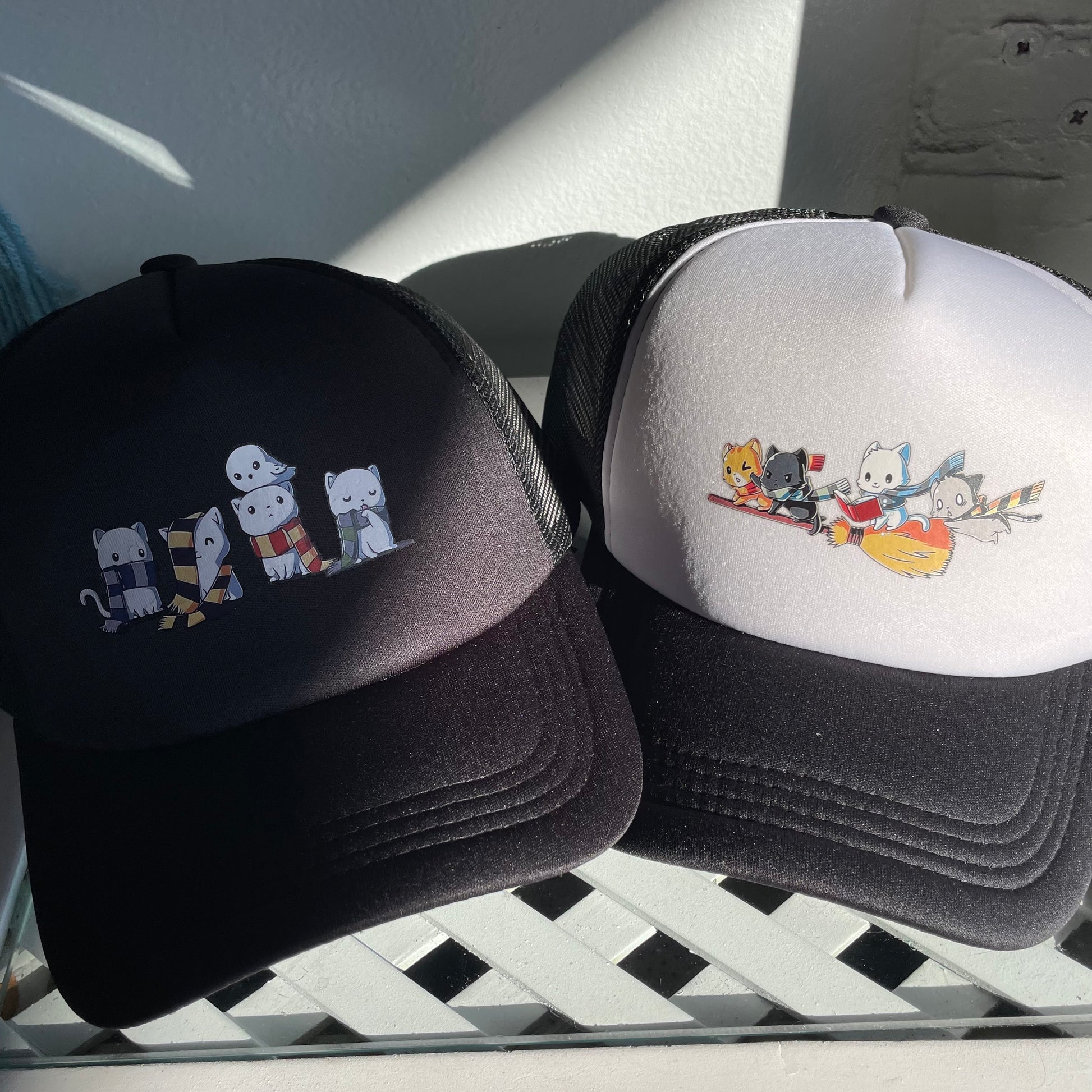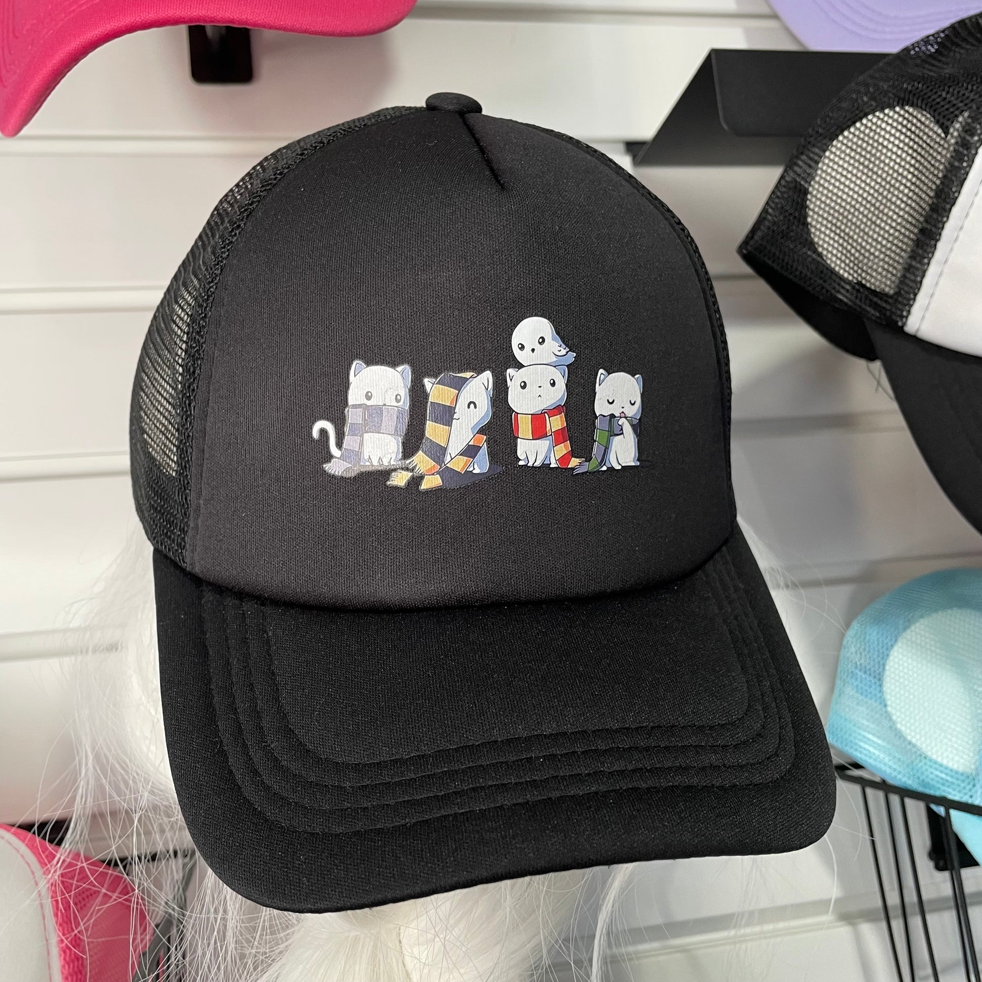 Introducing the Potter Cats Trucker Hat! This quirky trucker hat features a breathable mesh back, perfect for keeping cool on sunny days. Show off your love for all things magical and feline with this fun accessory. Meow!