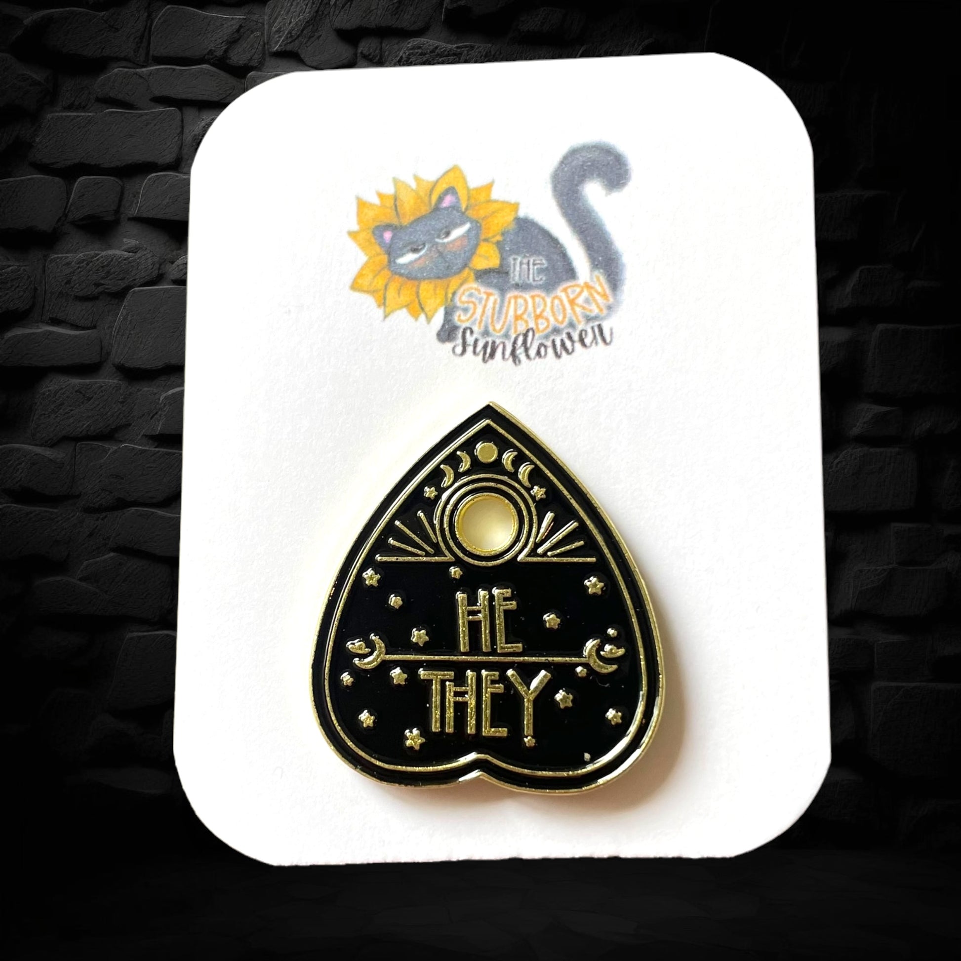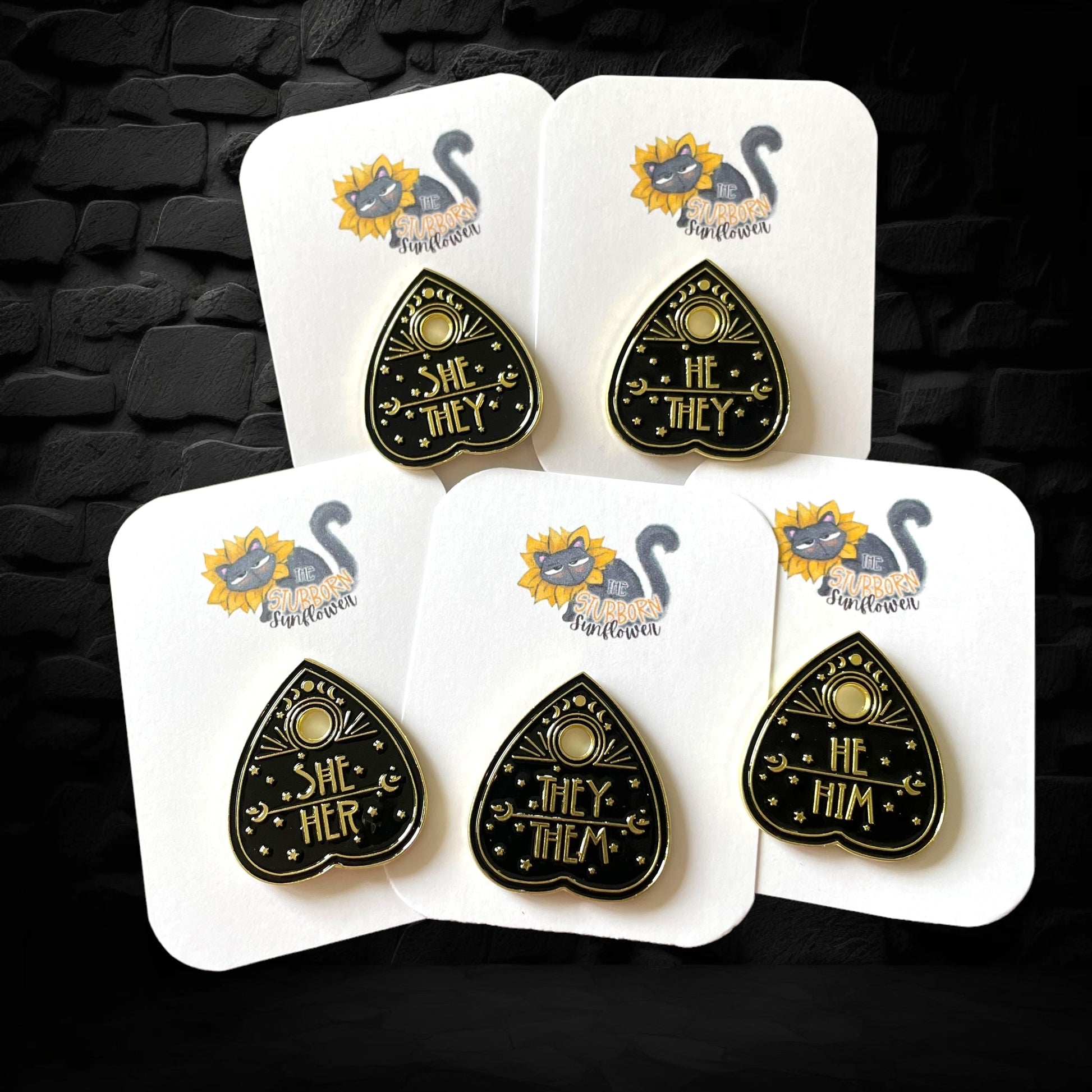 Claim your pronouns in a whimsical way with these Planchette Pronoun Pins! Shaped like a planchette, these unique pins add a touch of personality to your wardrobe while showcasing your preferred pronouns. No need to take yourself too seriously - these pins speak for themselves.