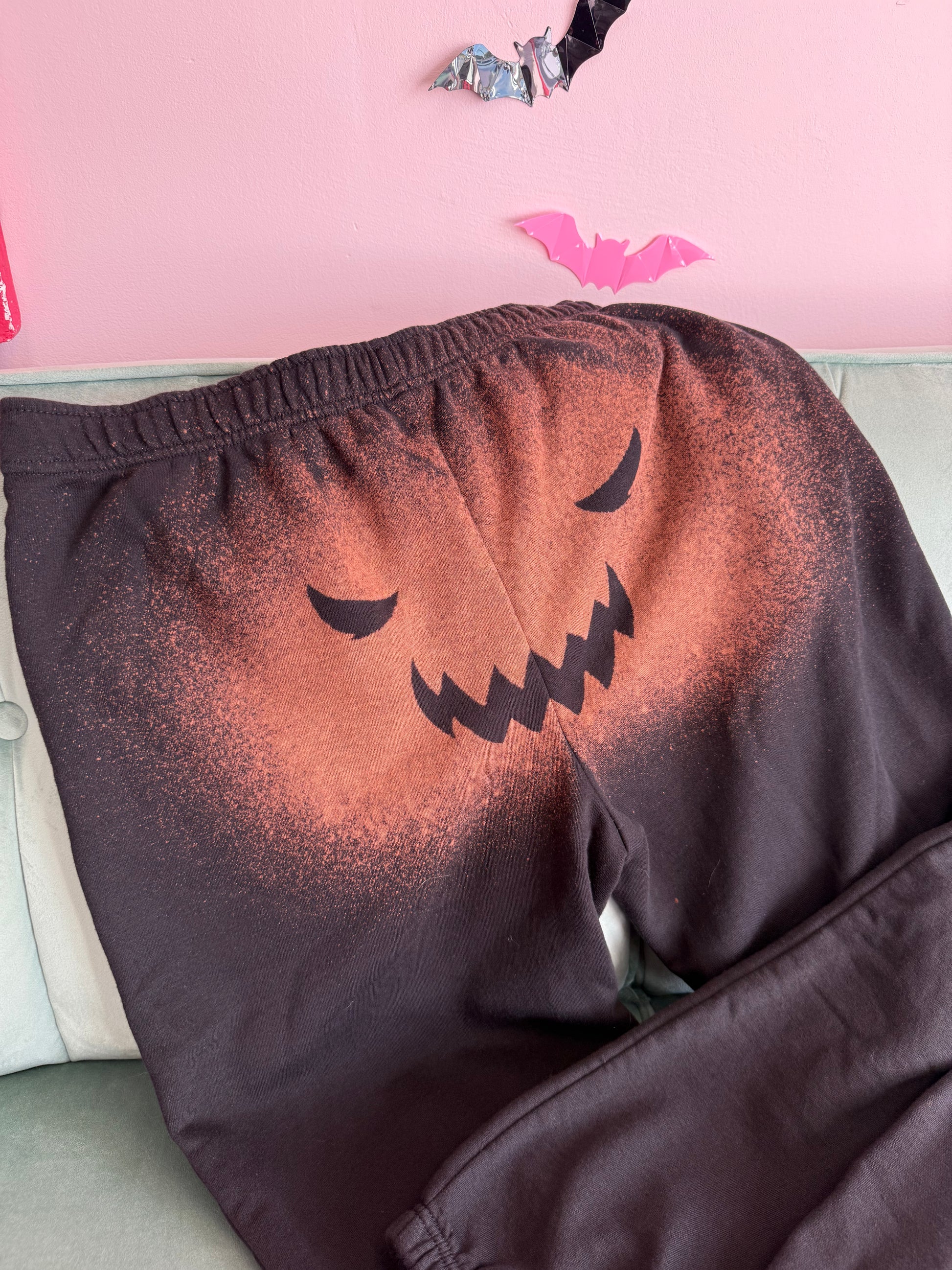 Get comfy and show off your style with our locally handcrafted Pumpkin Pants. Made with hand bleached fabric, these sweatpants are a one-of-a-kind statement piece. Perfect for lounging or making a bold fashion statement. (Sweatpants have never looked this good!)