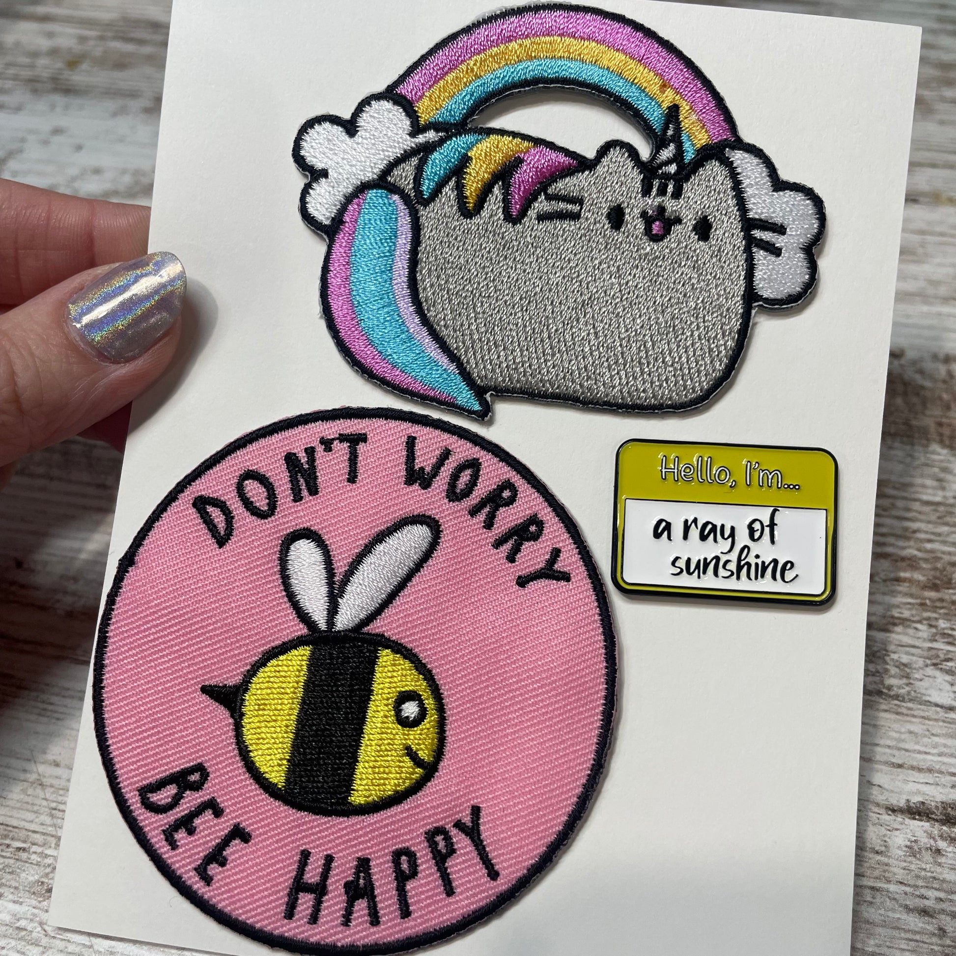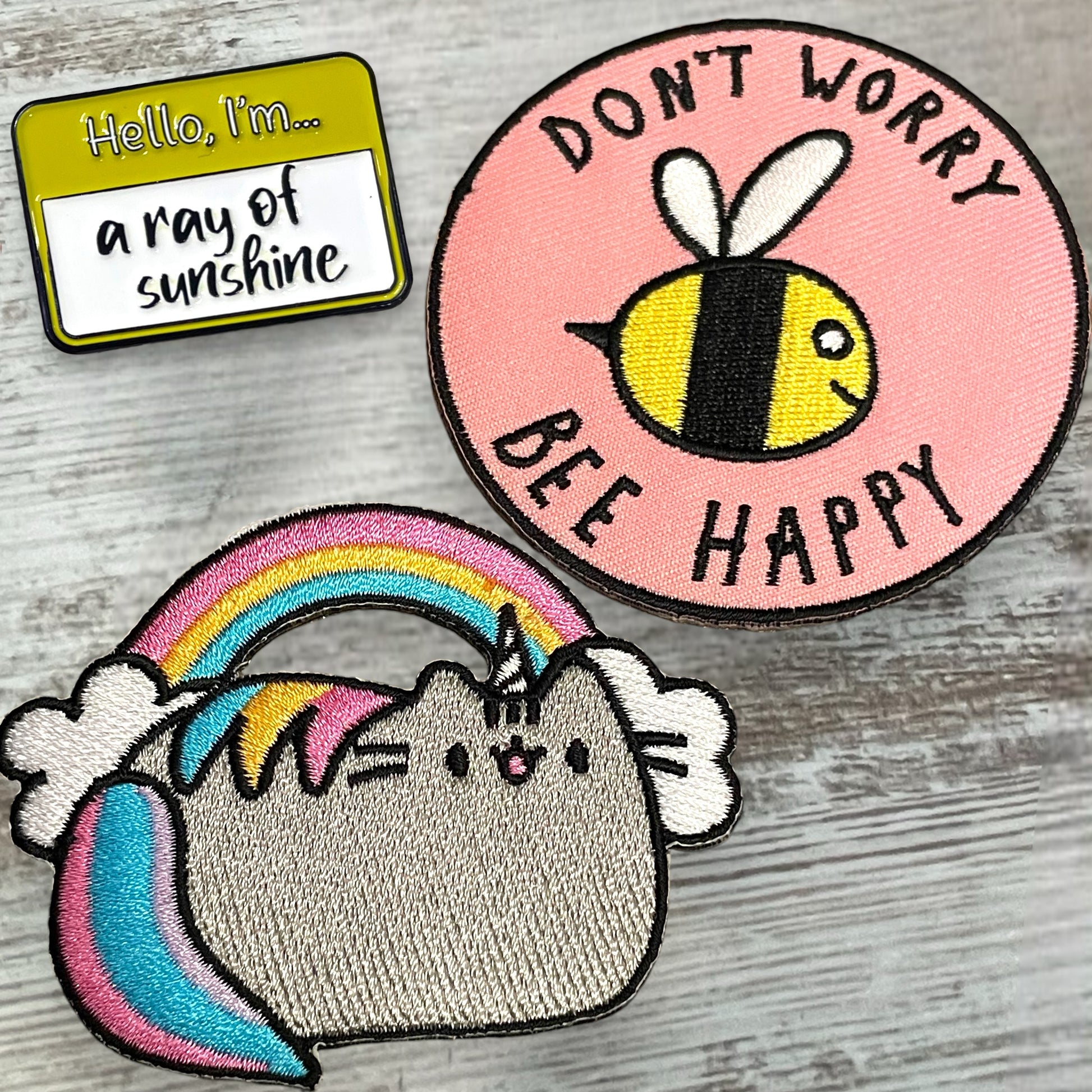 Ray of Sunshine Pin, Bee Happy & Pusheen Patches