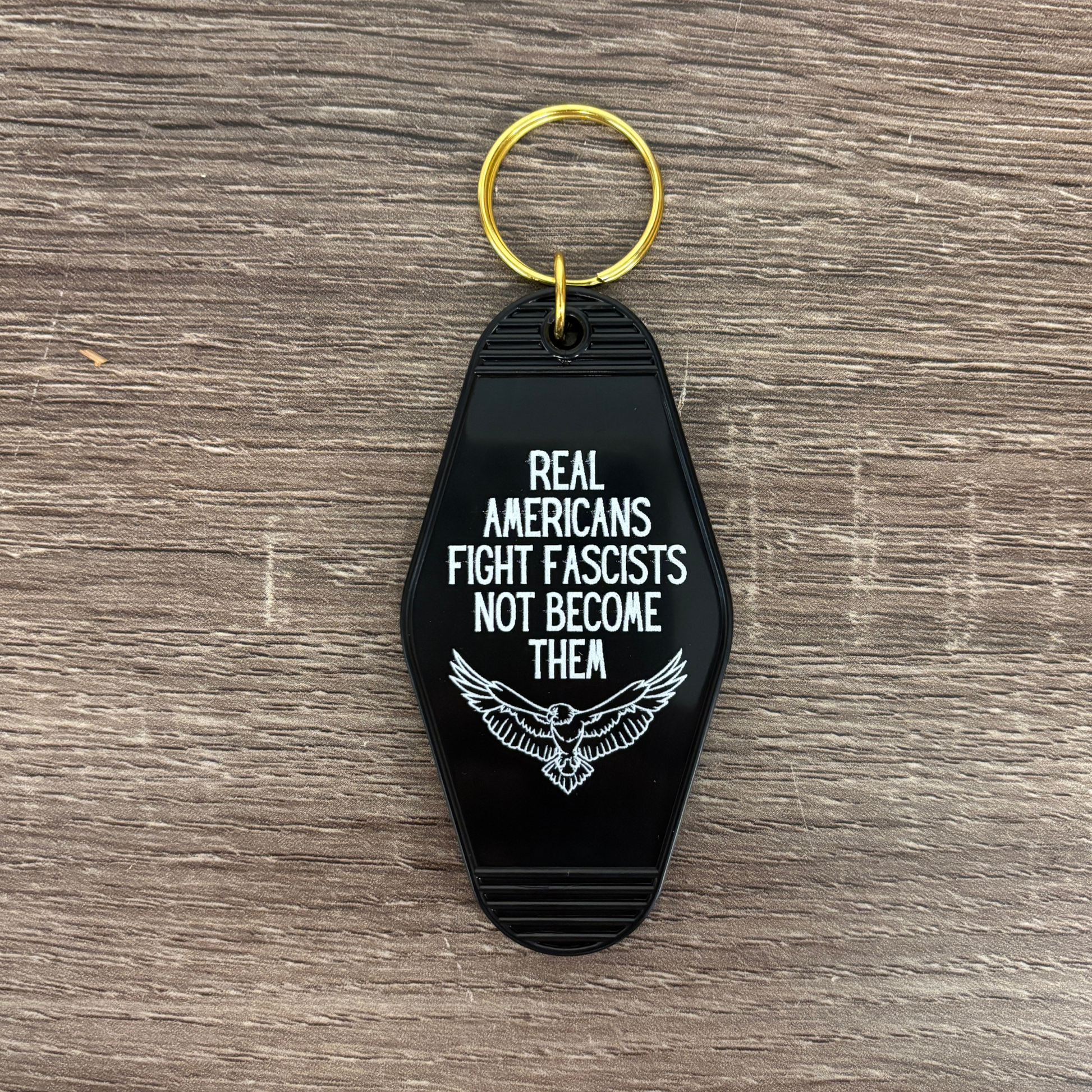 Keep your keys secure with this black motel-style keychain featuring a bold message. This keychain serves as a subtle reminder to stand firm in your beliefs and makes a practical and meaningful accessory for daily use or as a thoughtful gift. Keychain reads "Real Americans Fight Fascists Not Become Them" Details: - Keychain is an adaptation from the classic hotel/motel key tags. - Approximate size: 3.75" x 1.75" and comes on a split ring.