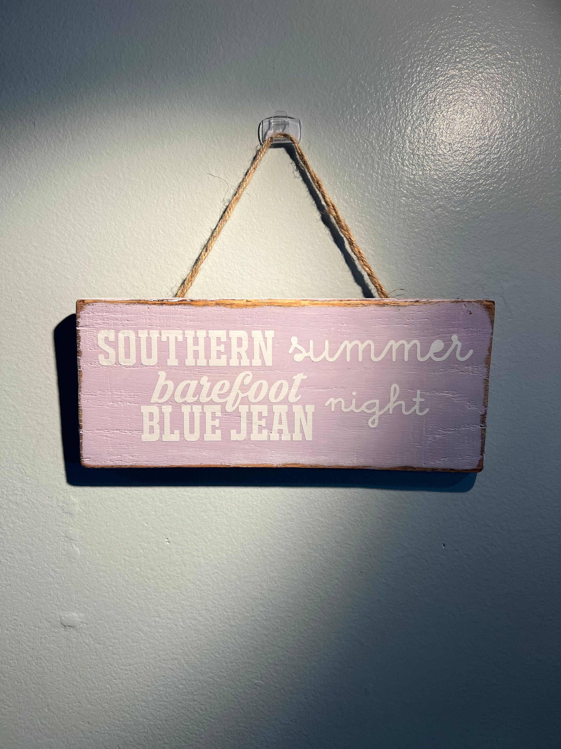 Relive those carefree days of summer with this one-of-a-kind Southern Summer Sign! Crafted from reclaimed wood, this sign is decorated with the phrase “Barefoot Bluejean Night” in the colors of summer - a vibrant purple. What a great way to add some nostalgia to any home!