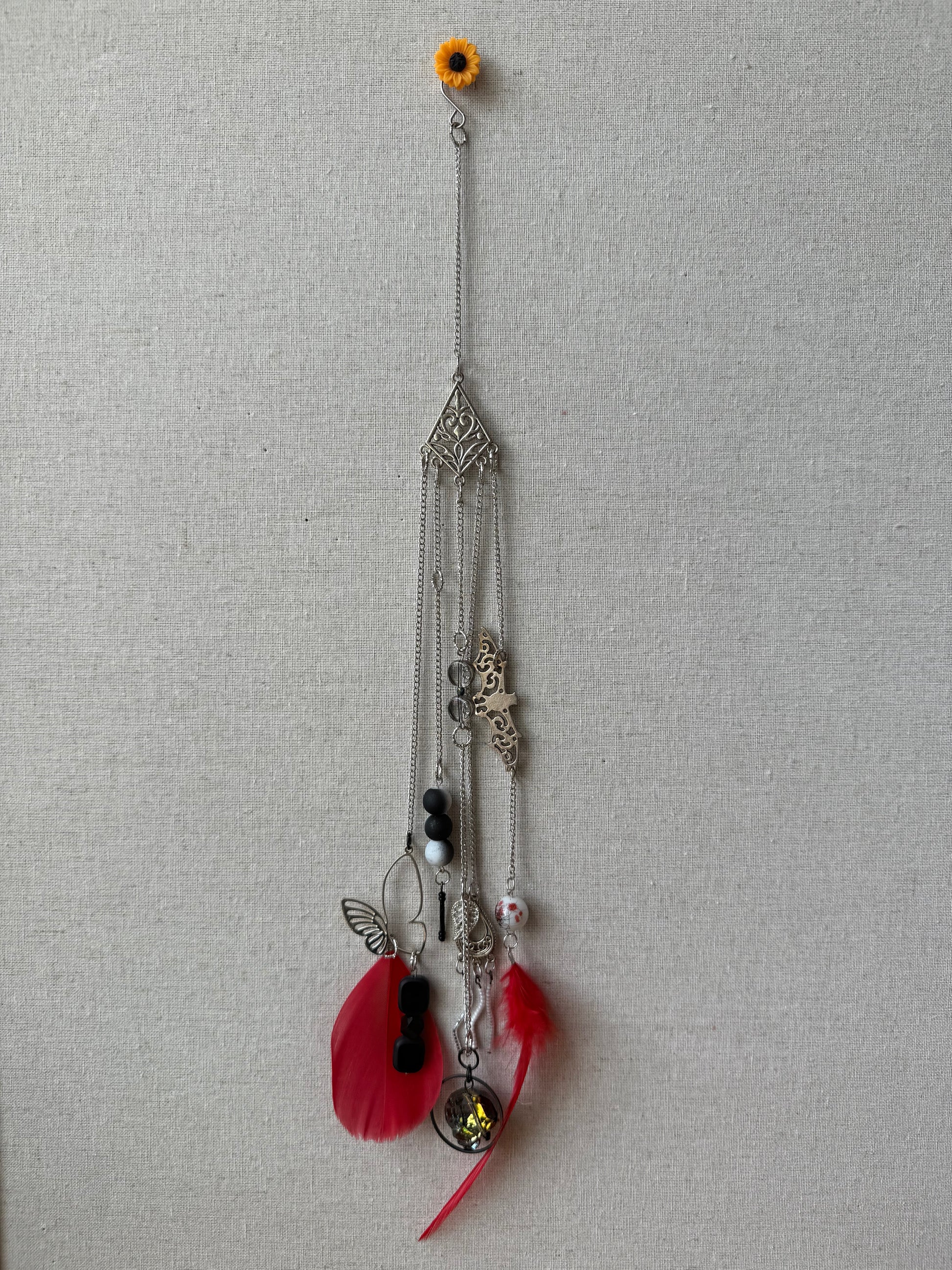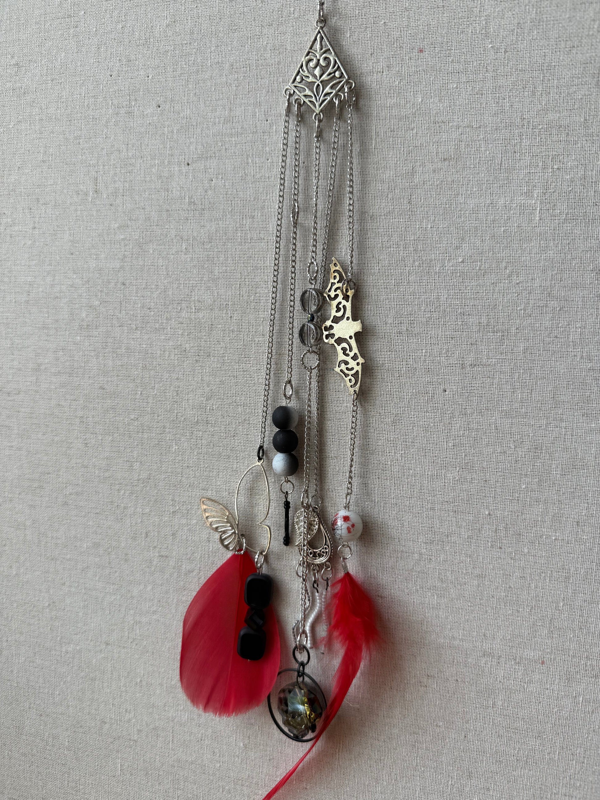 This Red Feather Suncatcher adds a touch of whimsy to any space. With a vibrant red feather and playful bat and butterfly charms, this beautiful Suncatcher is sure to catch the eye and brighten up your day. A must-have for any quirky and fun-loving home!