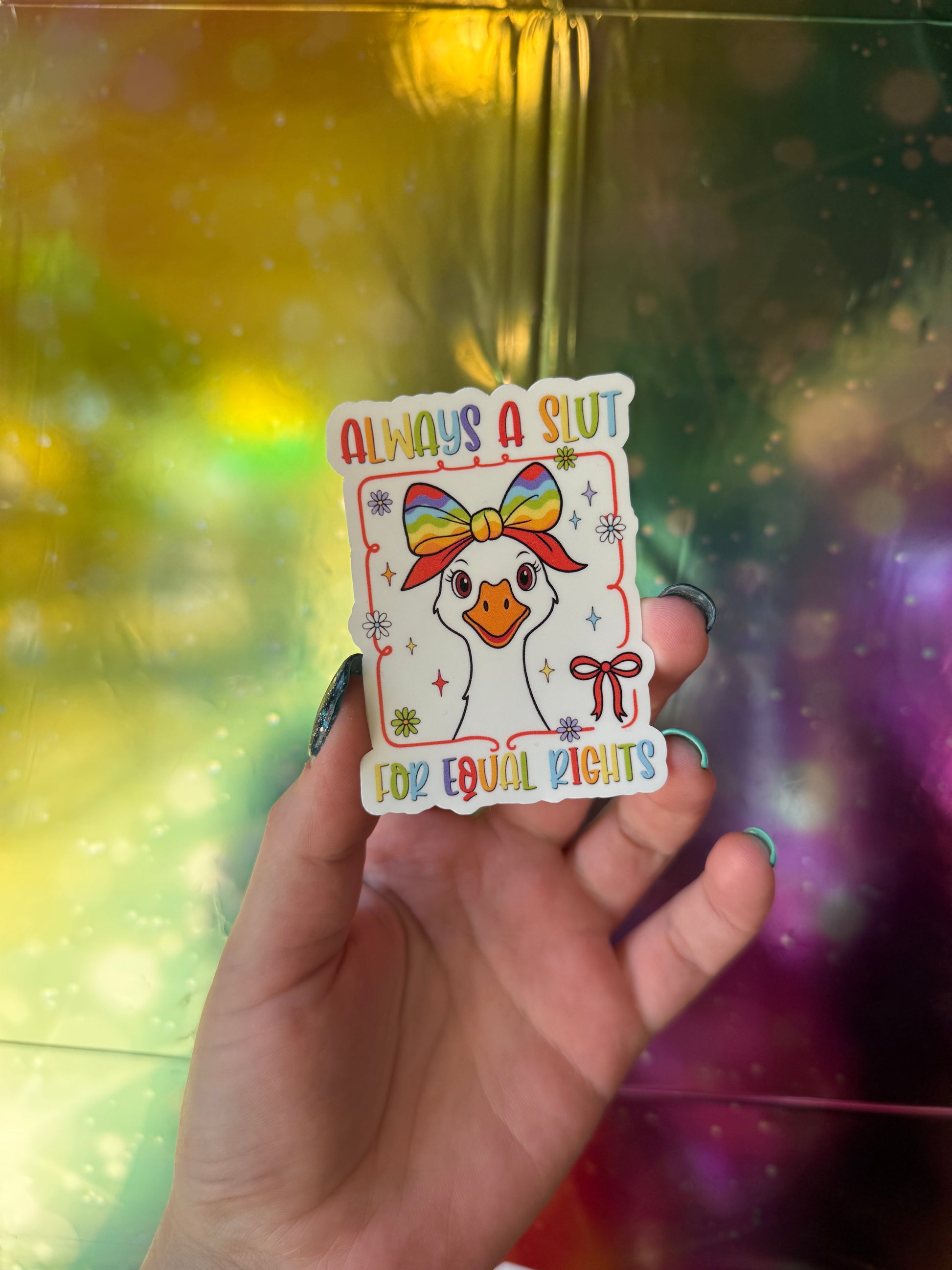 Express your support for equality with our Slut For Equal Rights sticker. This bold statement piece features a playful goose and vibrant pride colors, spreading a message of inclusivity and love. Stick it on your laptop, water bottle, or anywhere else to show your commitment to equal rights.
